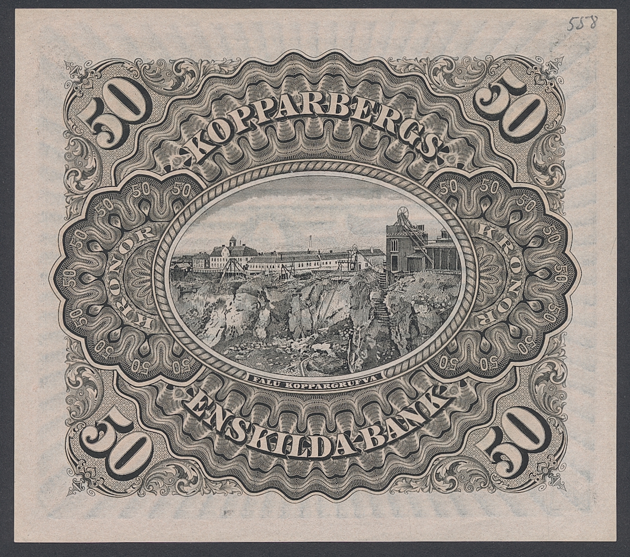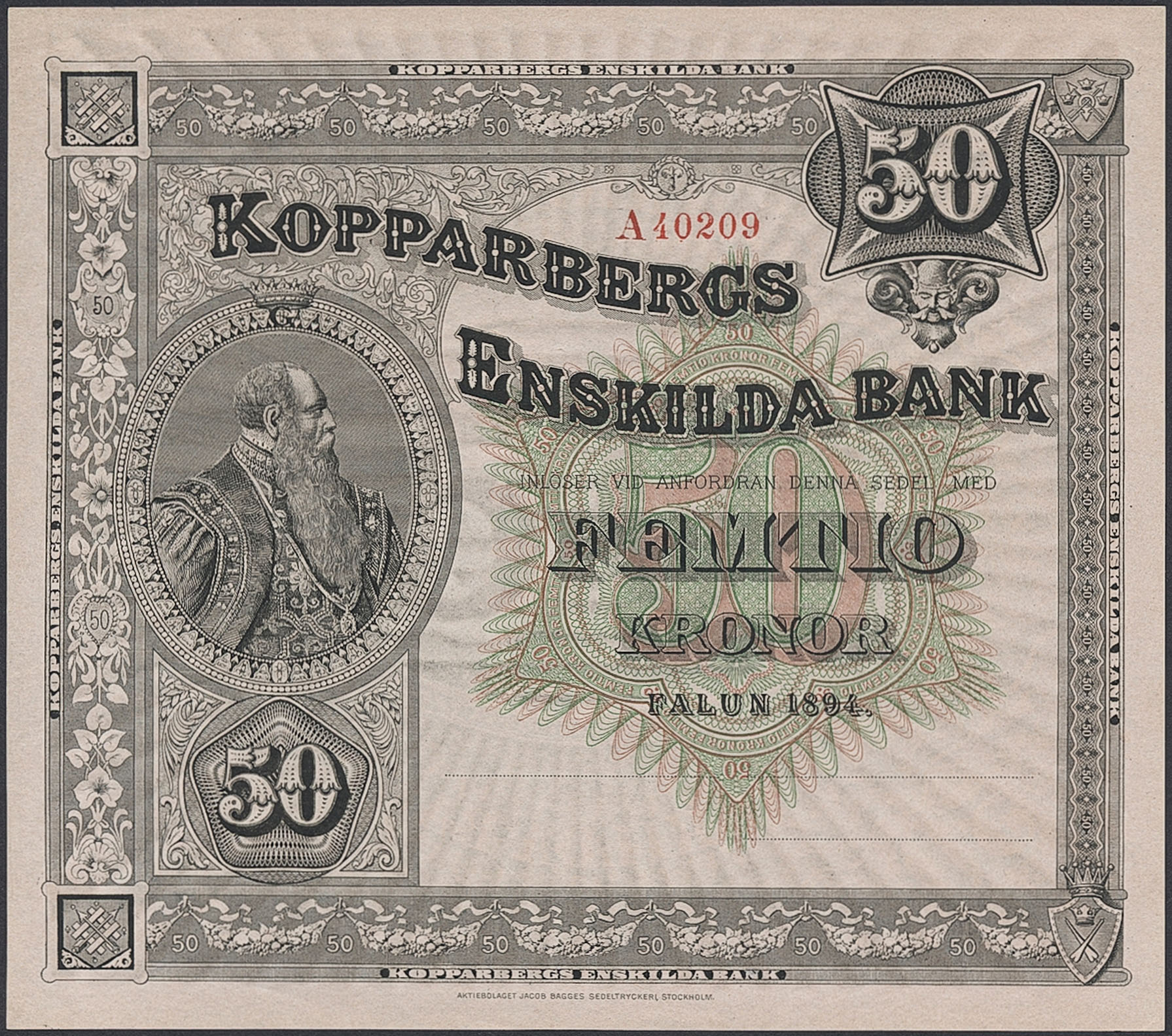 Private banknotes, Sweden. Pick S571r, 50 kronor 1894. A40209. Unissued remainder without signatures. Small pencil writing on reverse '558'. 01.