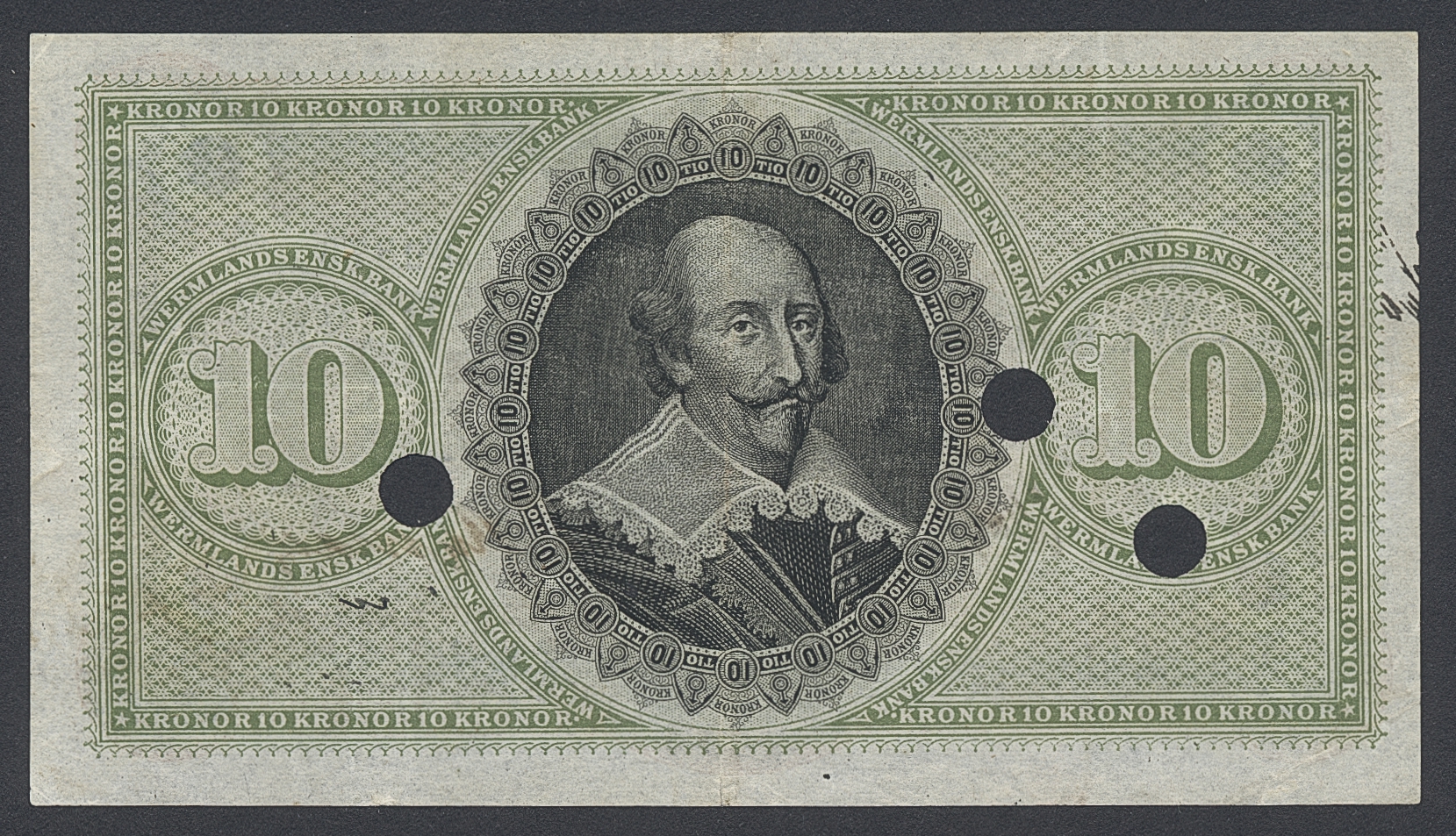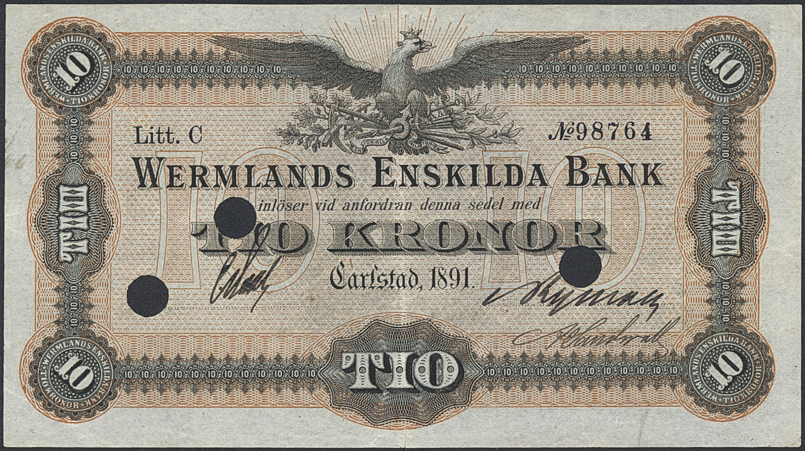 Private banknotes, Sweden. Pick S691, 10 kronor 1891. Litt C. No 98764. Punch cancelled, pressed. 1/1+.