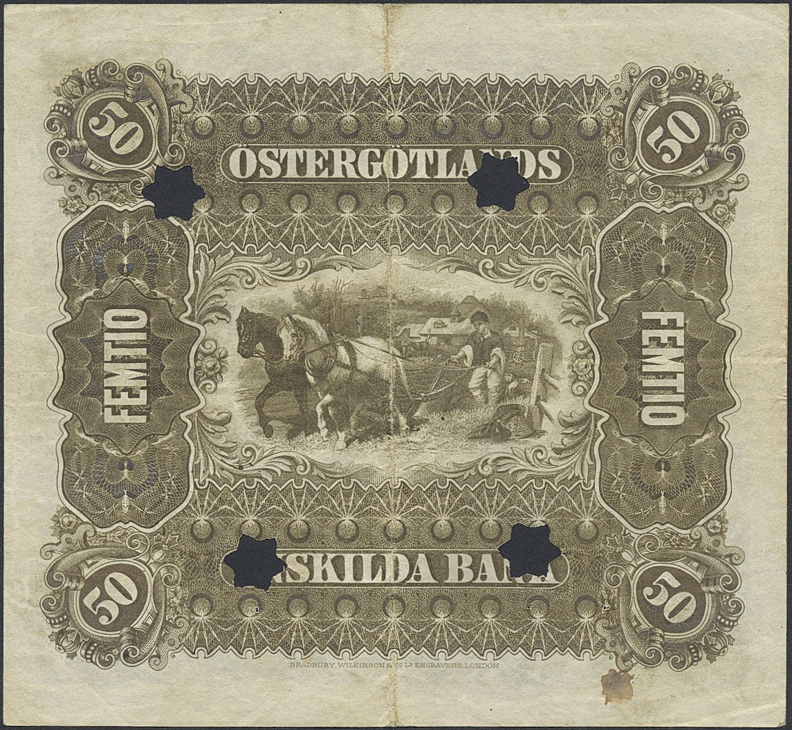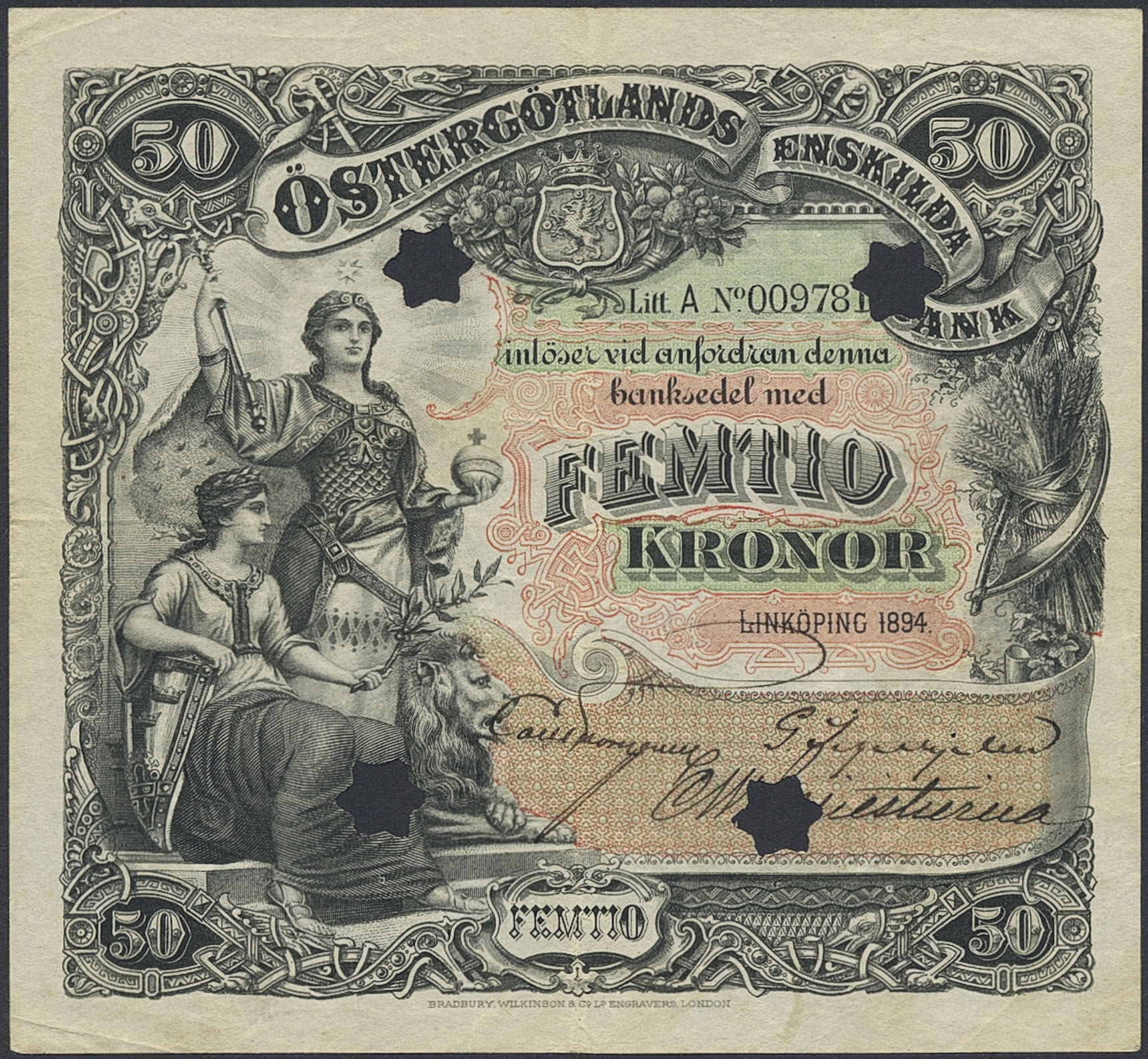 Private banknotes, Sweden. Pick S738b, 50 kronor 1894. Litt A. No 009781. Punch cancelled. 1+.