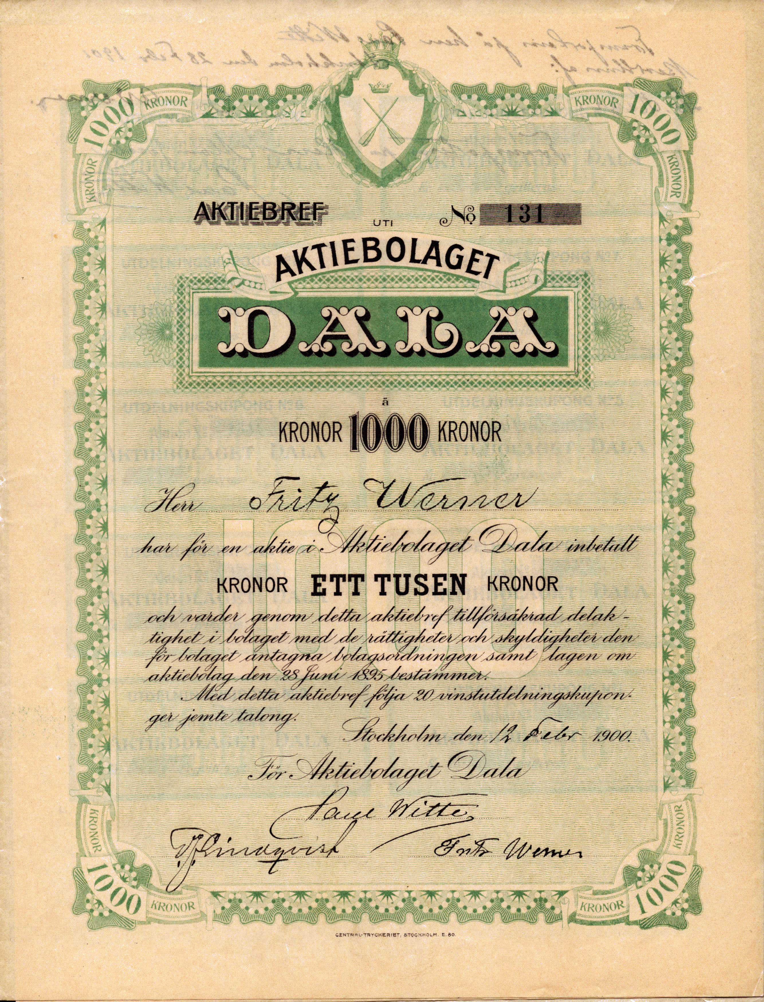 Stock certificates, Sweden. RSA 1126, 1000 kronor 1900. Aktiebolaget Dala No: 131 28 juni 1900, Aktieägare Fritz Werner. 01/0.