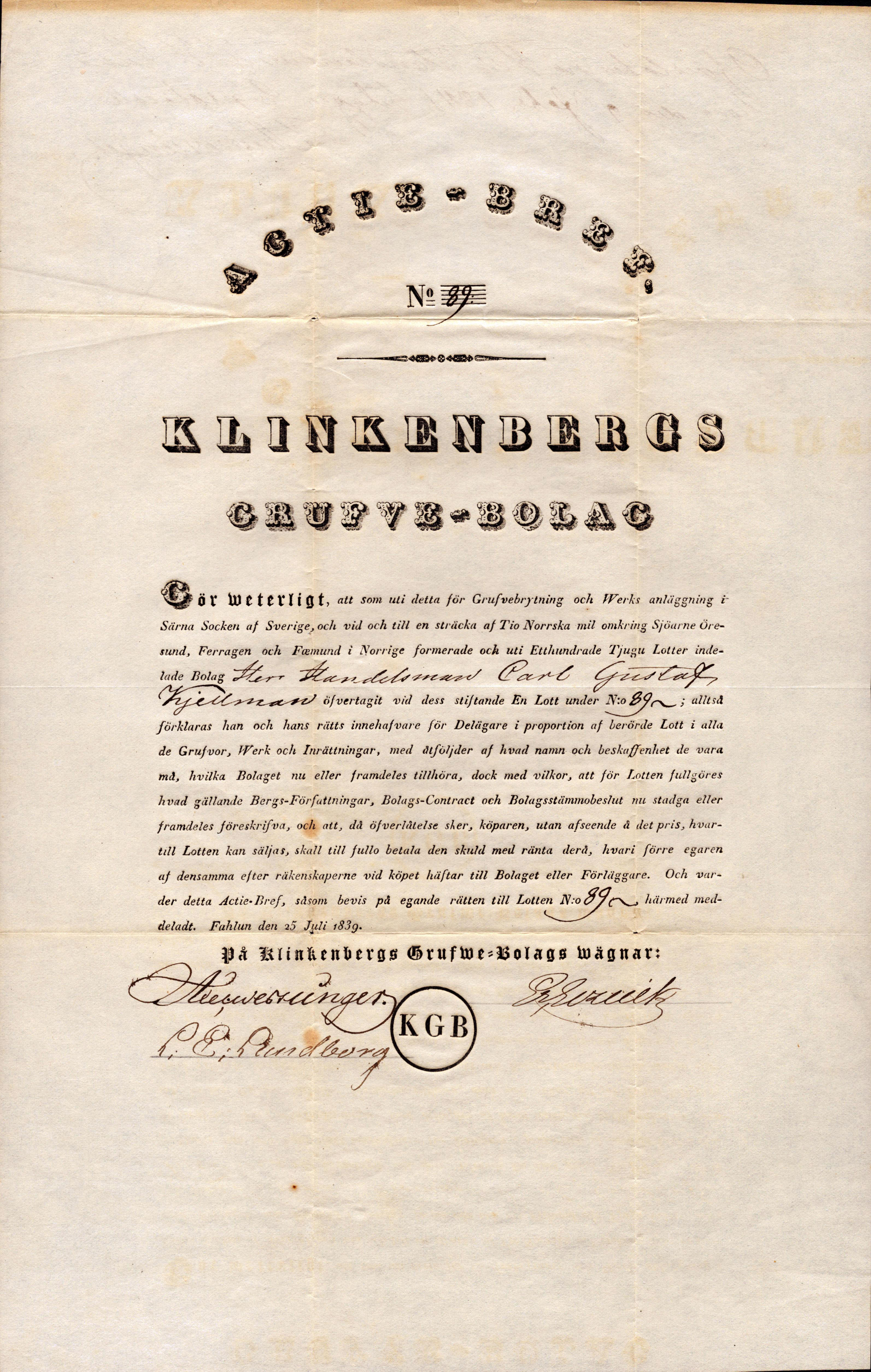 Stock certificates, Sweden. RSA 3368, 1 /120 del 1839. Klinkenbergs grufe-bolag No: 89 Fahlun den 25 juli 1839, Aktieägare: Herr Handelsman Carl Gustaf Kjellman. RAR. 01.