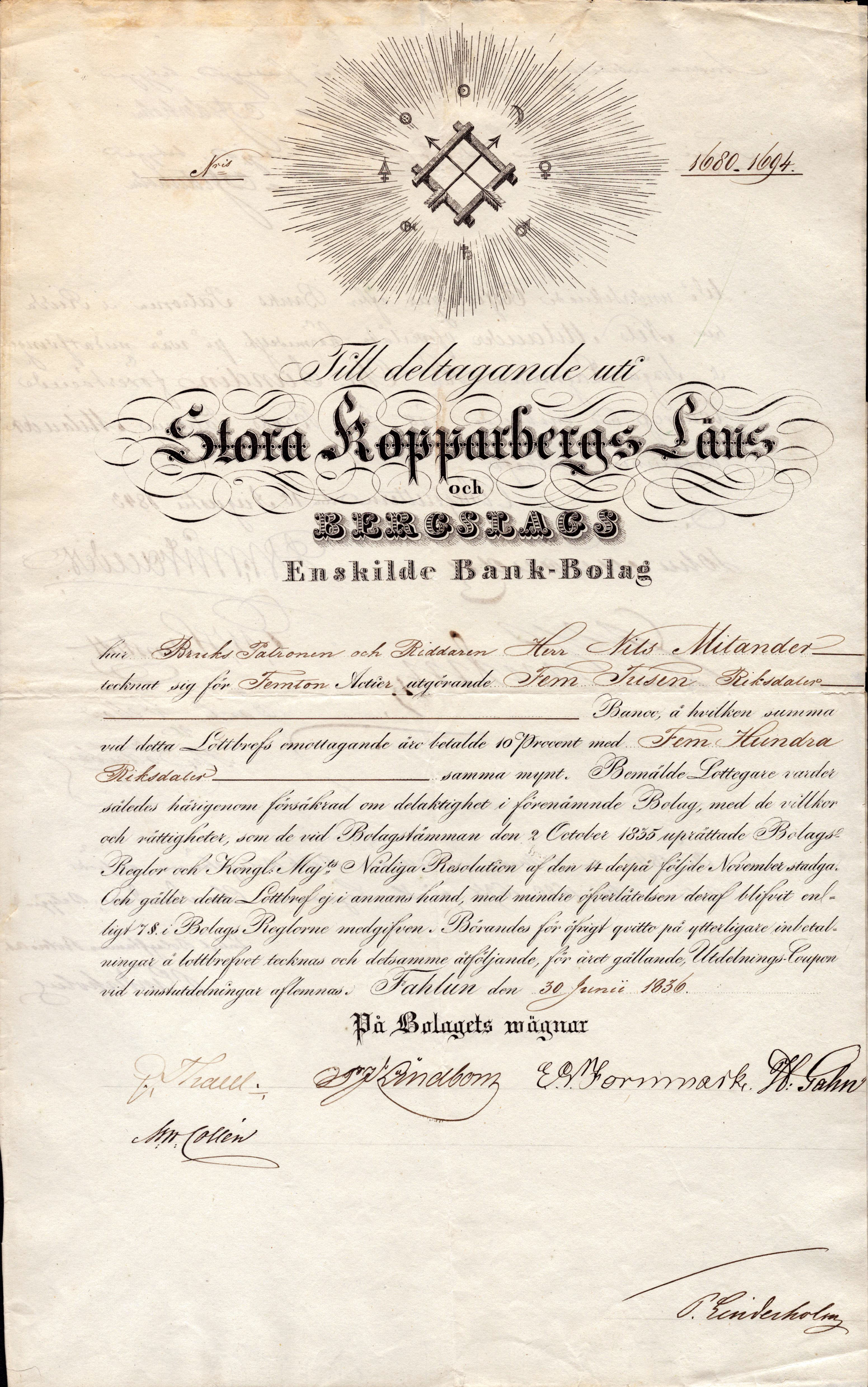 Stock certificates, Sweden. 5000 riksdaler 1836. Stora Kopparbergs läns och bergslags enskilde bank-bolag No: 1680–1694 Fahlun den 30 junii 1836, Aktie ägare: Brukspatronen och Riddaren Herr Nils Mitander. Ej registrerad i litteraturen. RAR. 1+/01.