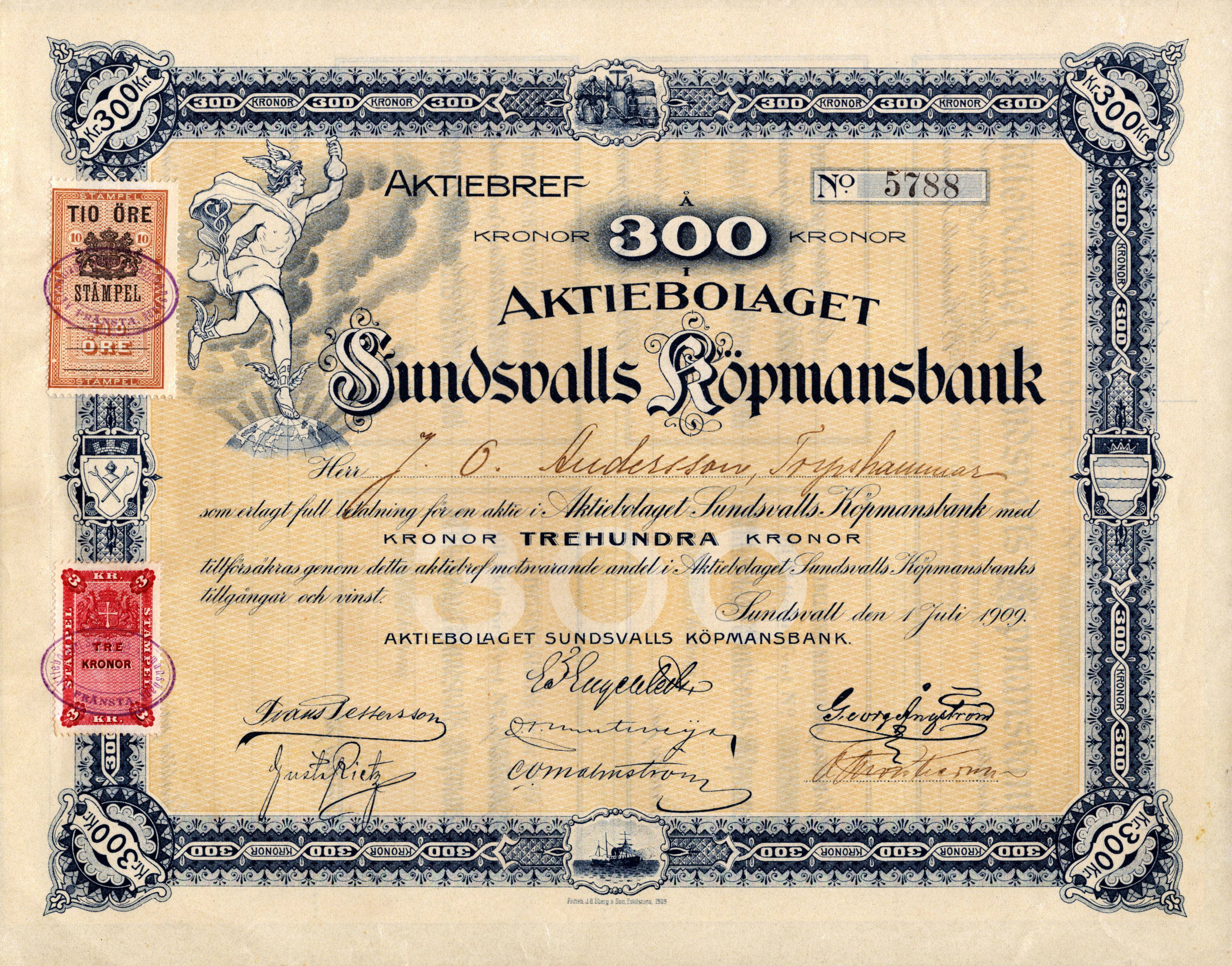 Stock certificates, Sweden. RSA 6544, 300 kronor 1909. Sundsvalls köpmansbank No: 5788 Sundsvall 1 juli 1909, Aktieägare: J.O Andersson Torpshammar. 01/0.