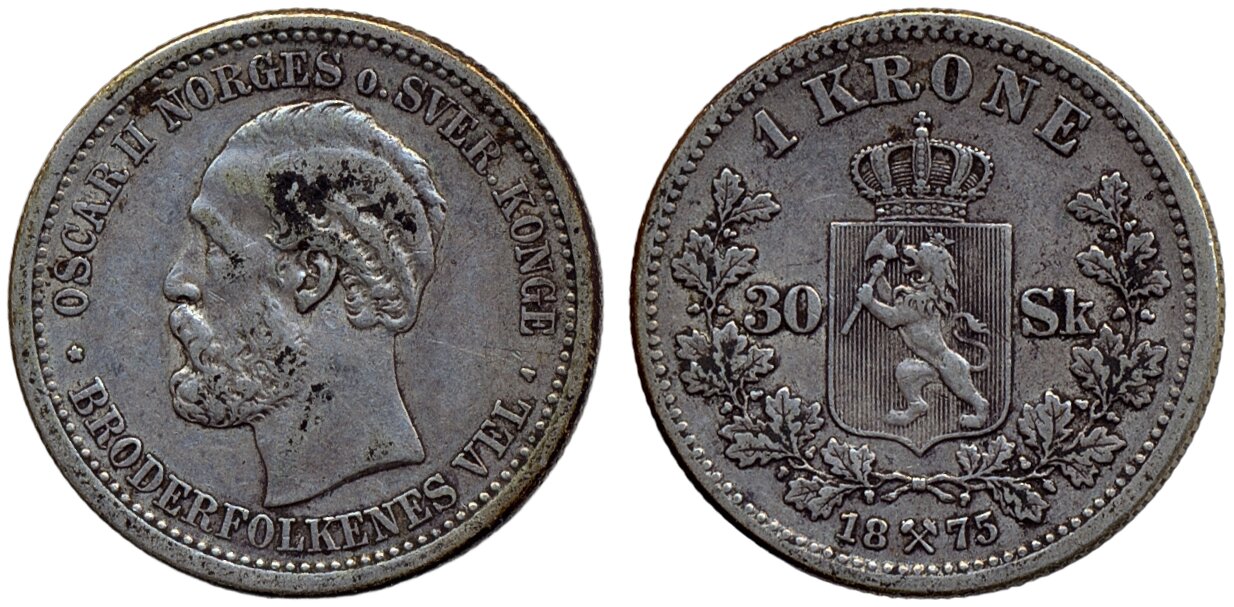 Coins, Norway. Oskar II, NM 30, 1 krone 1875. 1/1+.