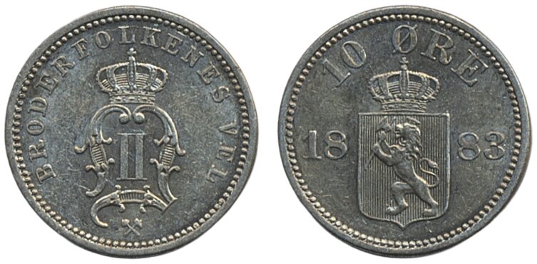 Coins, Norway. Oskar II, NM 85, 10 øre 1883. 01/0.