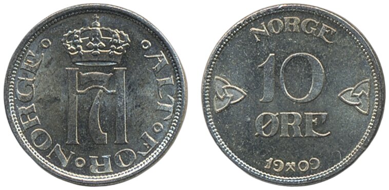 Coins, Norway. Haakon VII, NM 107, 10 øre 1909. 01/0.