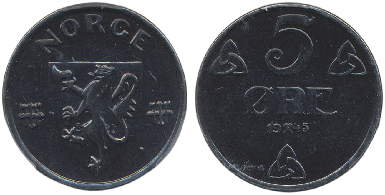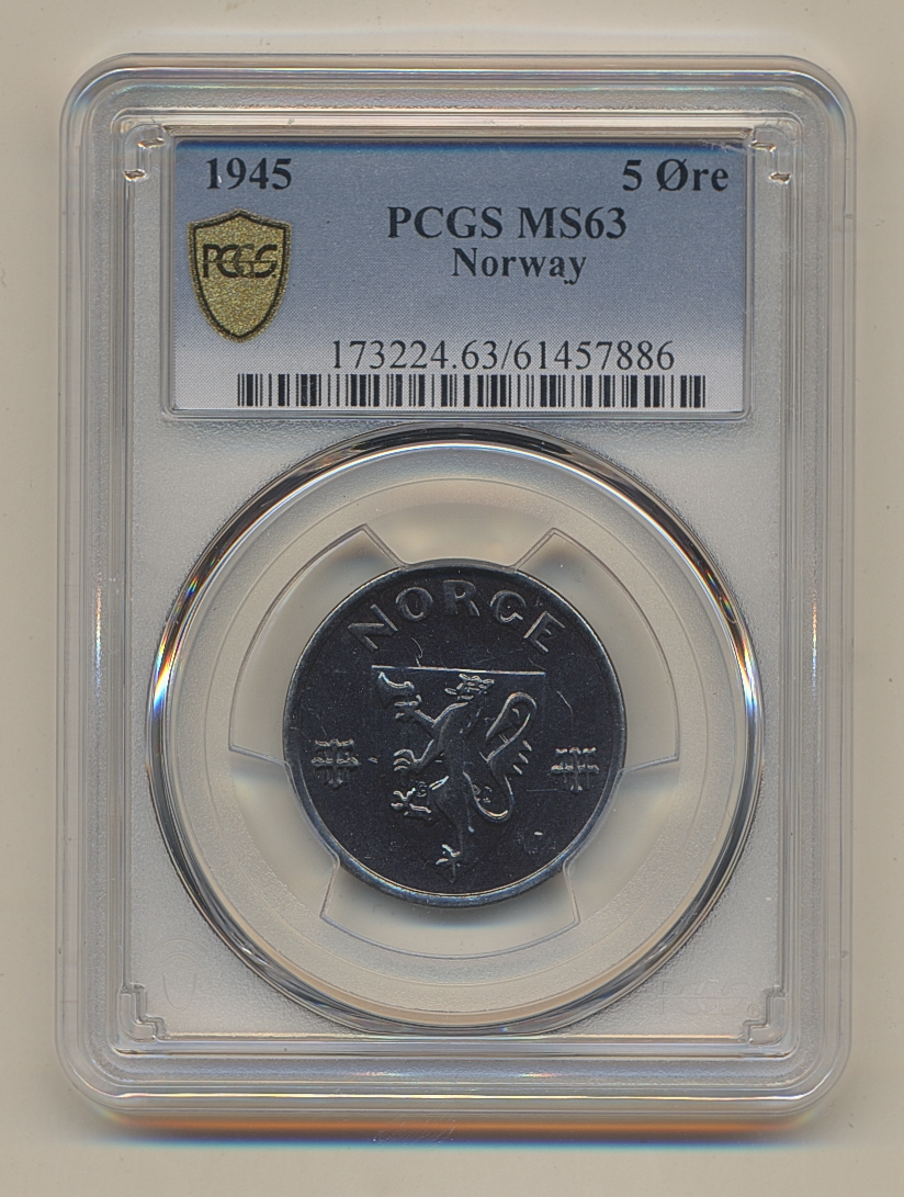Coins, Norway. Haakon VII, NM 286, 5 øre 1945. Superb example with full mint lustre. Graded by PCGS as MS63. 01/0. See certification at PCGS