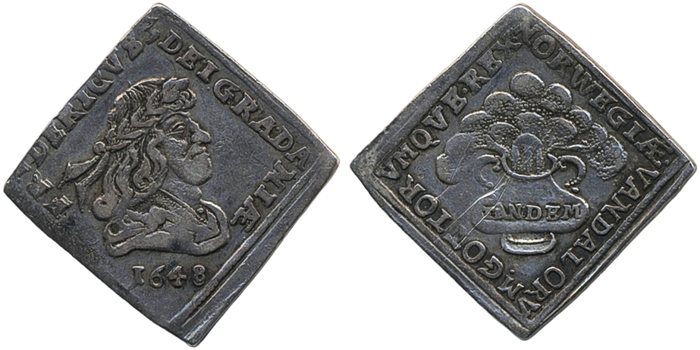 Coins, Denmark. Frederik III, Sieg 66, 1/6 speciedaler 1648. 4.76 g. Klippe coinage to coronation. Reverse scratches. Hede 48. 1+.