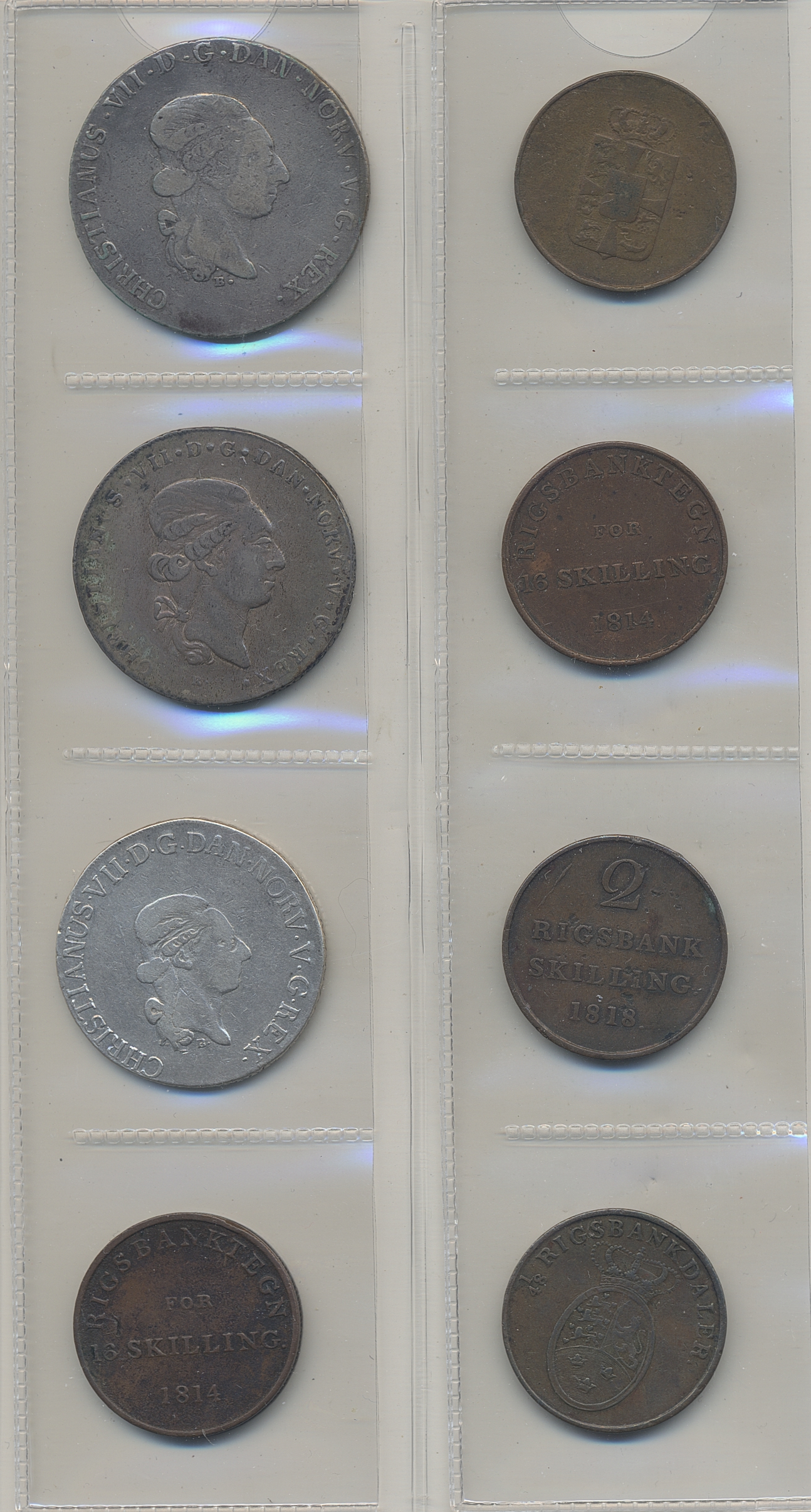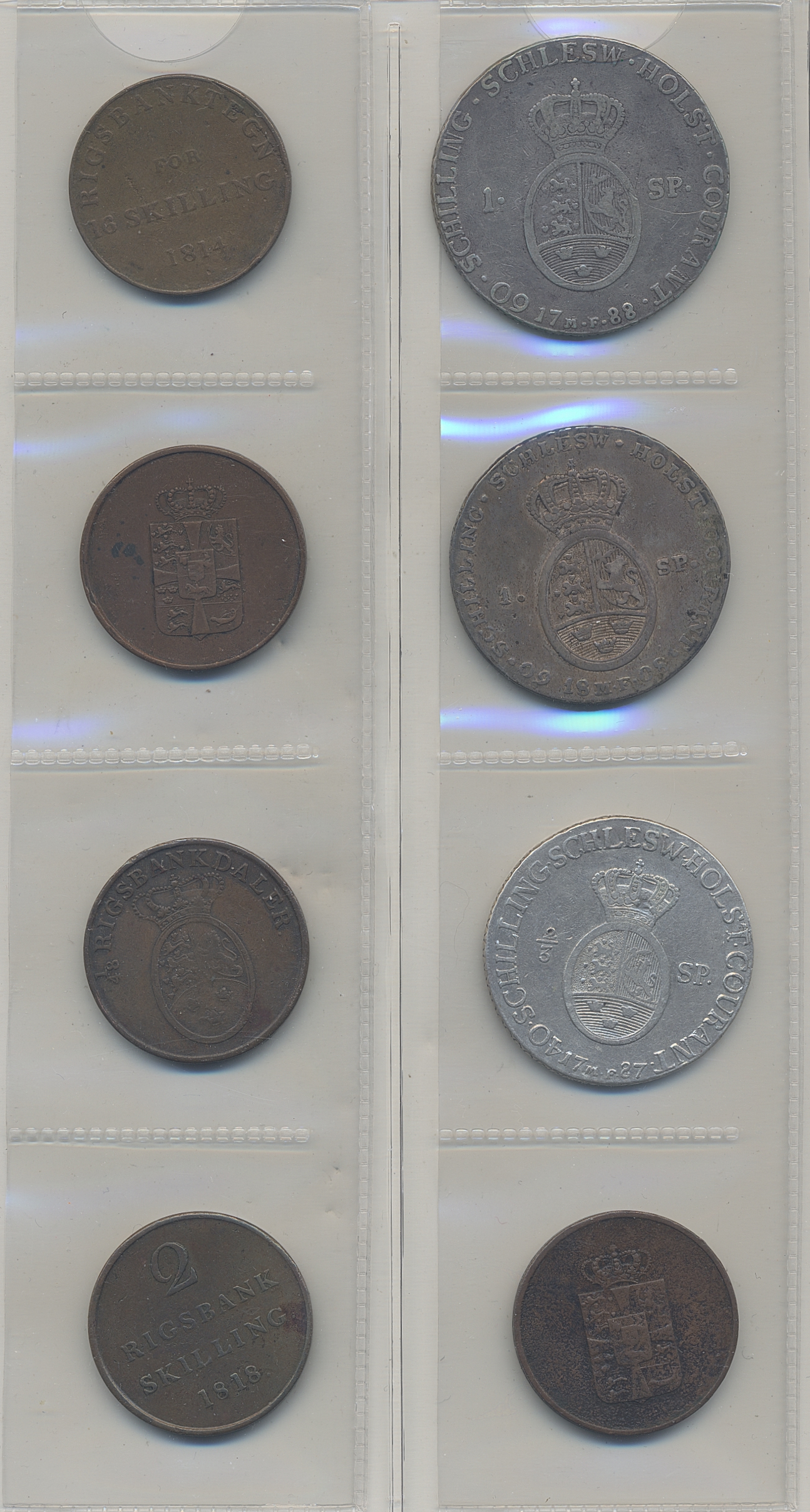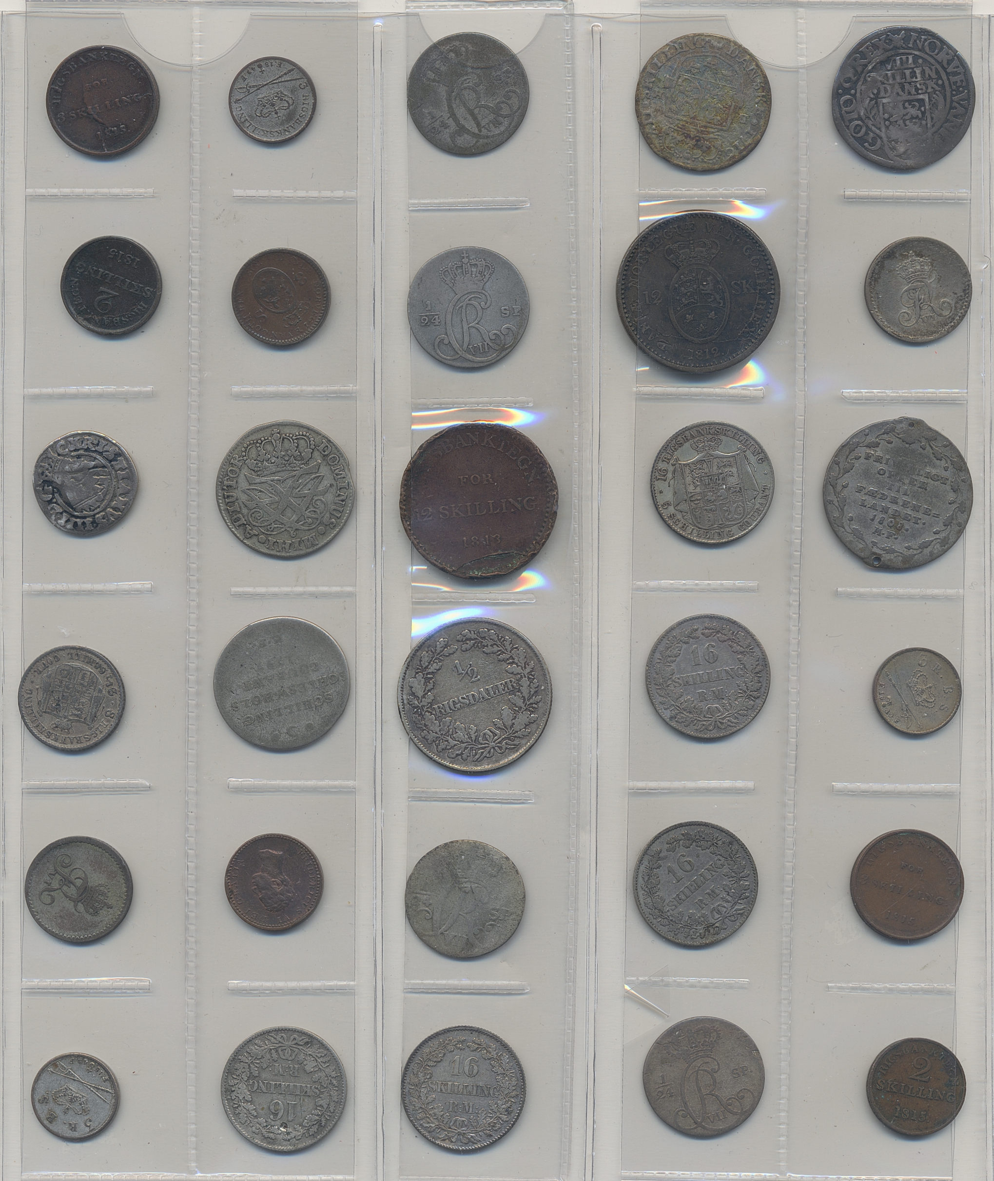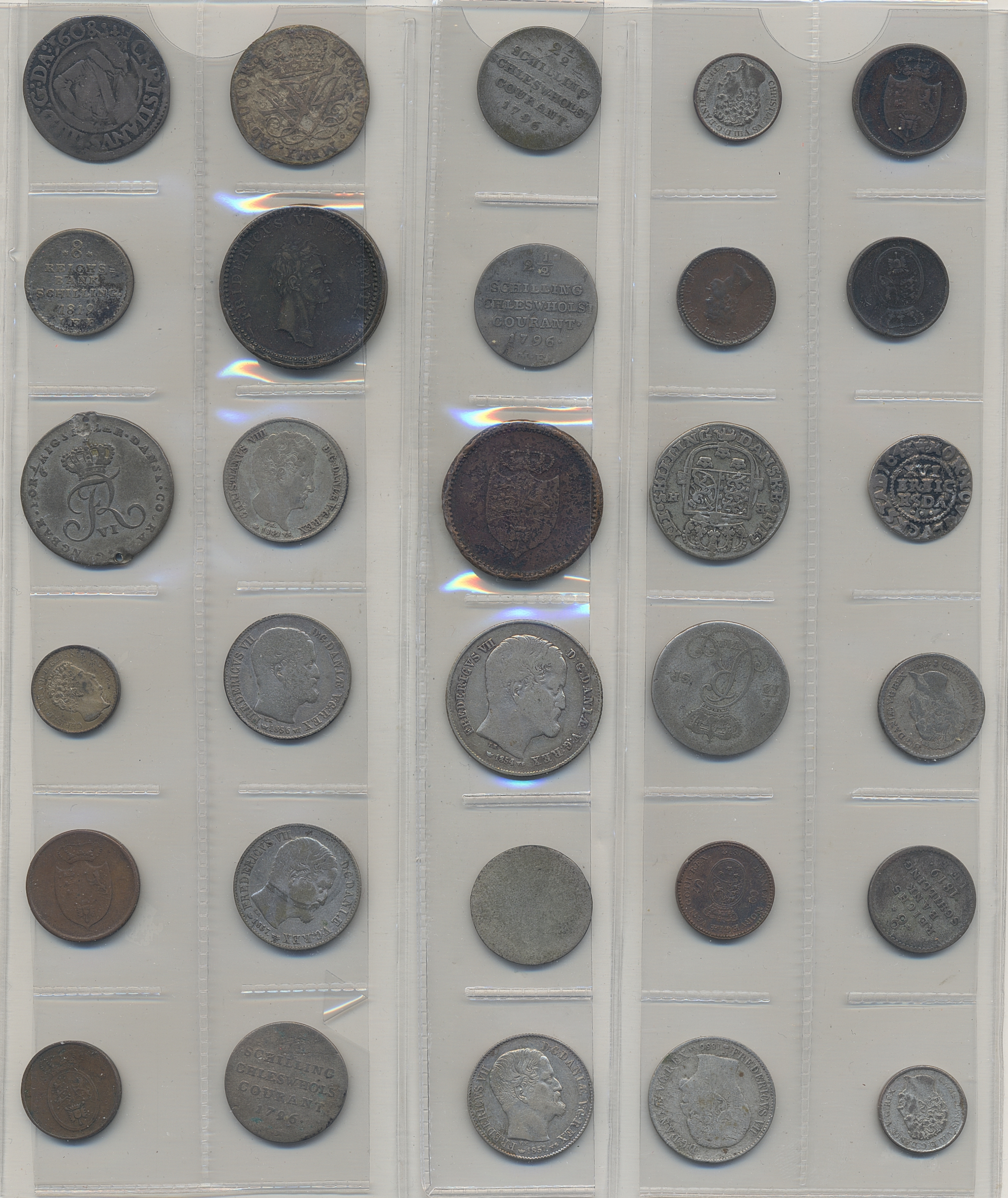 Coins, Denmark. Small group of silver and bronze coins from 1600s–1800s including many of Schlesvig Holstein. Please inspect! 2-1+.