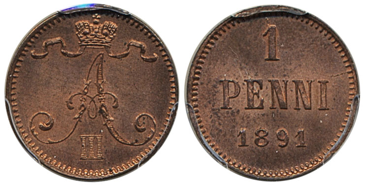 Coins, Finland. Alexander III, KM 10, 1 penni 1891. Graded by PCGS as MS65 RD. Full red lustre. Bitkin 254. 0. See certification at PCGS