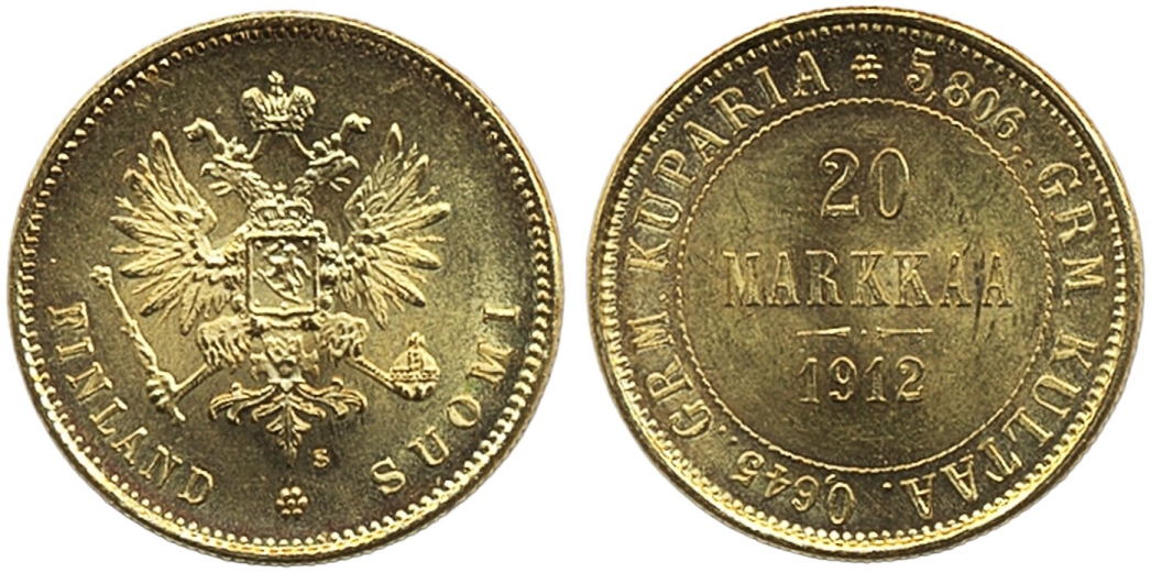 Coins, Finland. Nicholas II, KM 9.2, 20 markkaa 1912. 6,45 g. 01.