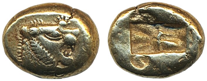 Coins, Ancient, Greek coins. Kingdom of Lydia. Alyattes (ca. 610–546 BC). Electrum Trite, 4.69 g. Head of roaring lion facing right / Double incuse square punch. SNG Cop. 449–451. F-VF.
