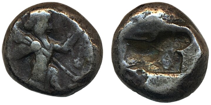 Coins, Ancient, Greek coins, Persia. Achaemenid Empire (ca. 4th century BC). Siglos, 4.90 g. Great King knee-running, holding bow and dagger / Oblong incuse. SNG Cop. 284–286. Slightly corroded. F.