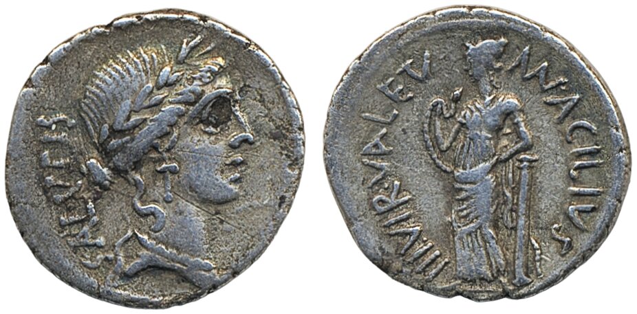Coins, Ancient, Roman Republic. M. Acilius Glabrio. Denarius, 3.63 g. (49 BC). Laureate head of Salus / Valetudo standing left. Minor corrosion. Crawford 442/1a. F.