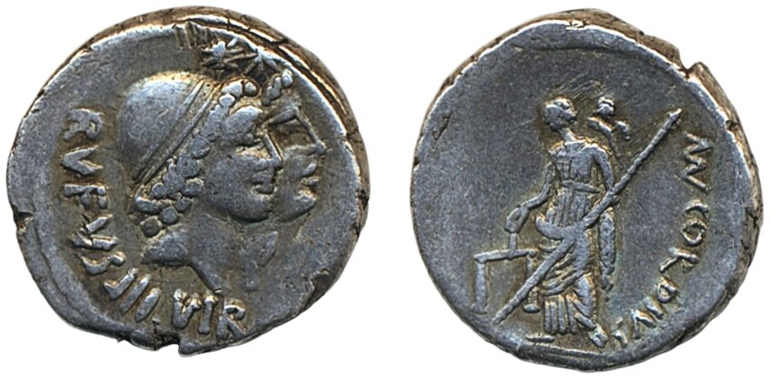 Coins, Ancient, Roman Republic. Civil War Period. Manius Cordius Rufus (46 BC). Denarius, 3.92 g. Jugate heads of dioscuri / Venus standing. Syd. 976. F.
