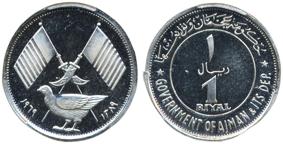 Coins, Ajman. KM 1.1, 1 riyal 1969. Graded by PCGS as PR65 DCAM. Proof. See certification at PCGS