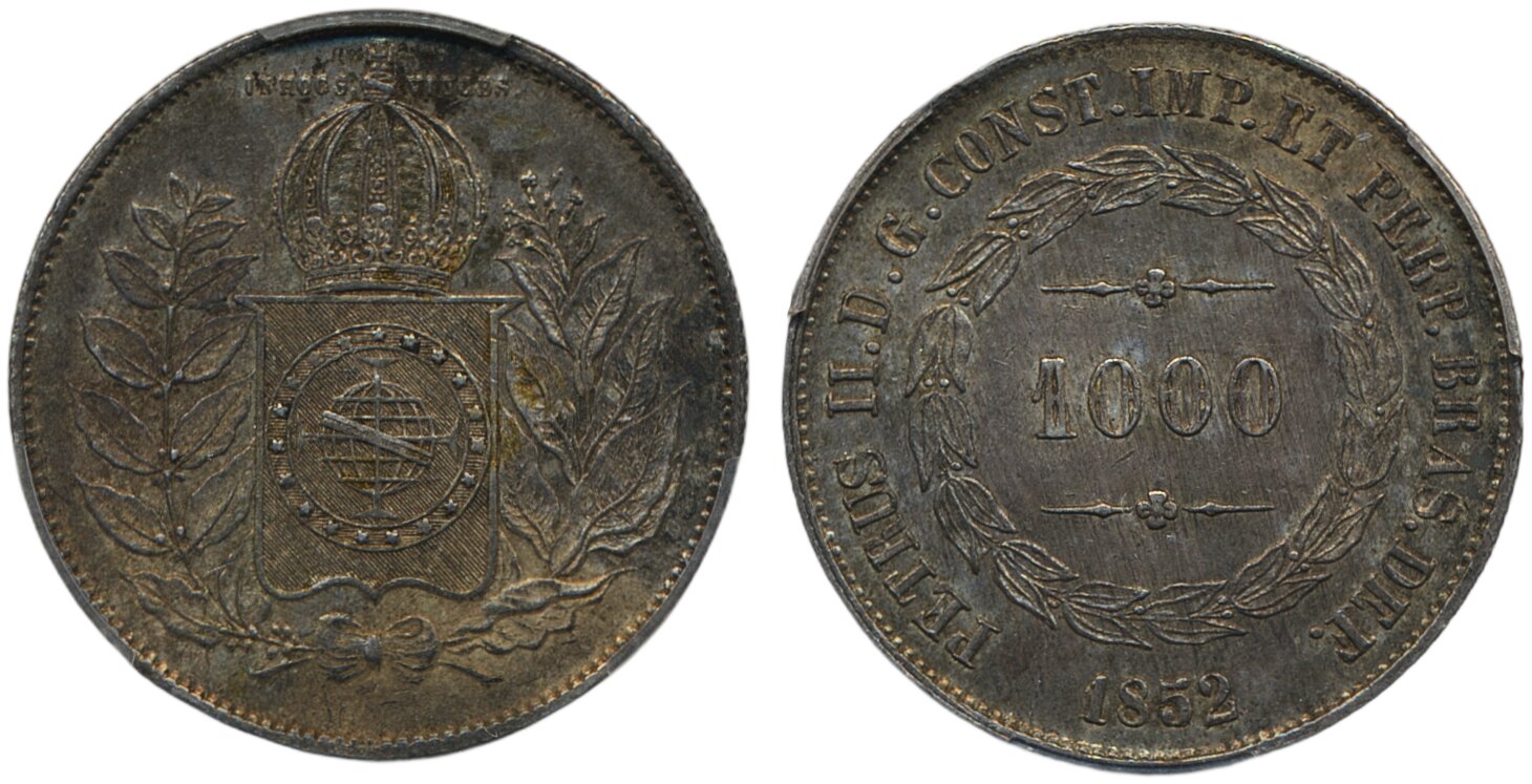 Coins, Brazil. Pedro II (1831-1889), KM 459, 1000 reis 1852. Graded by PCGS as MS62. XF-UNC. See certification at PCGS