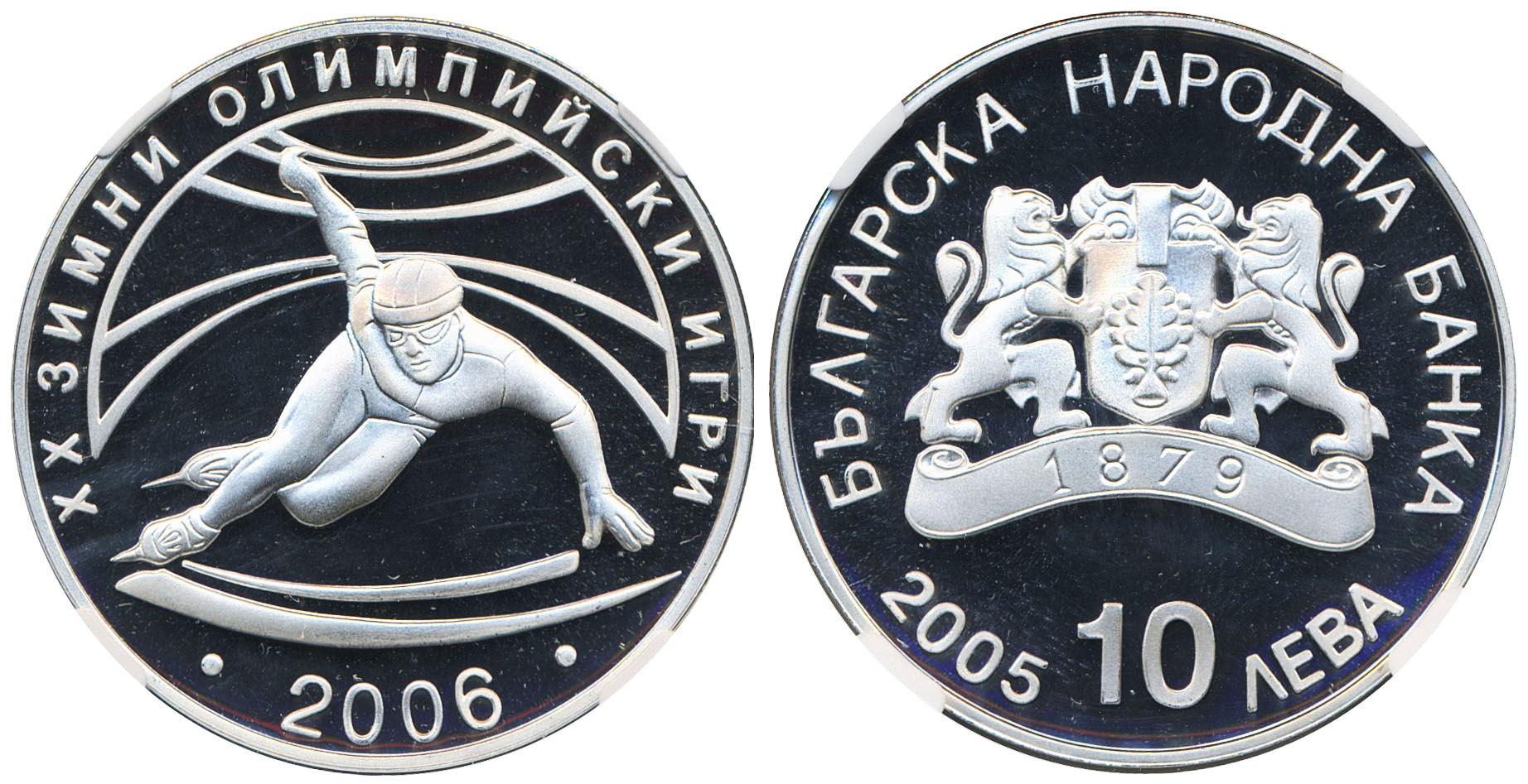 Coins, Bulgaria. KM 280, 10 leva 2005. Speedskating Olympics Turin. Graded by NGC as PF 69 ULTRA CAMEO. Proof. See certification at NGC