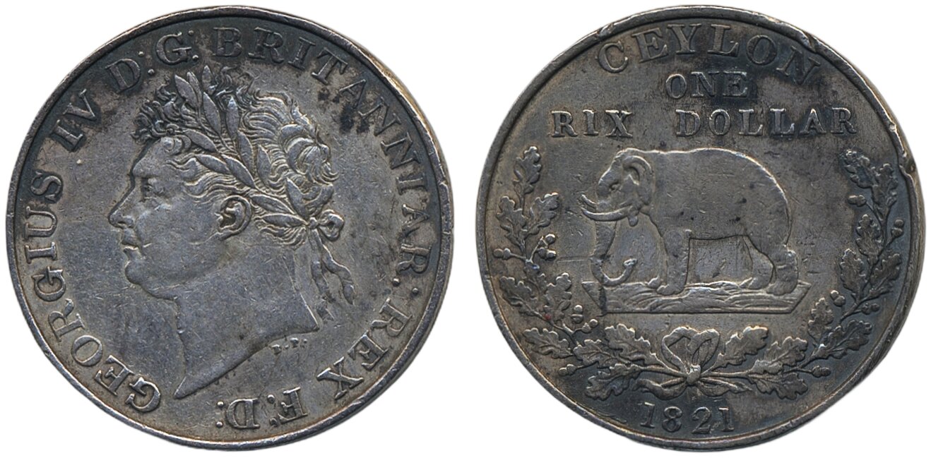 Coins, Ceylon (GB). George IV (1820-1830), KM 84, 1 rixdollar 1821. Small rim nicks. VF.
