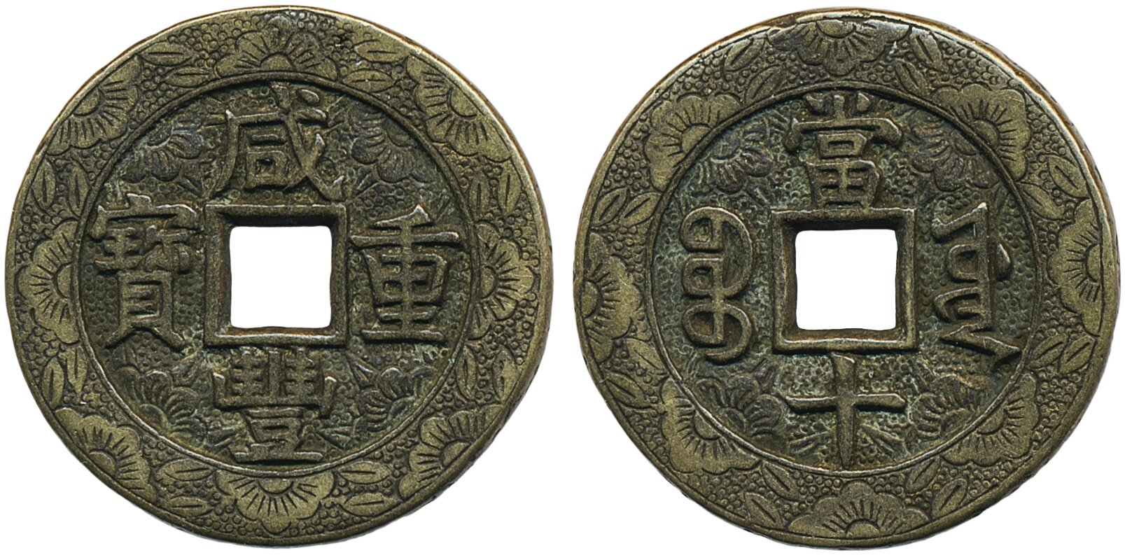 Coins, China, Ancient. Qing Dynasty - Emperor Wen Zong (1851-61), Hartill 22.758, 10 cash ND(1857-61). Board of Works mint. 13.95 g. 32 mm. Beautiful example with floral engravings as a charm. From collection of Scandinavian origin. XF.