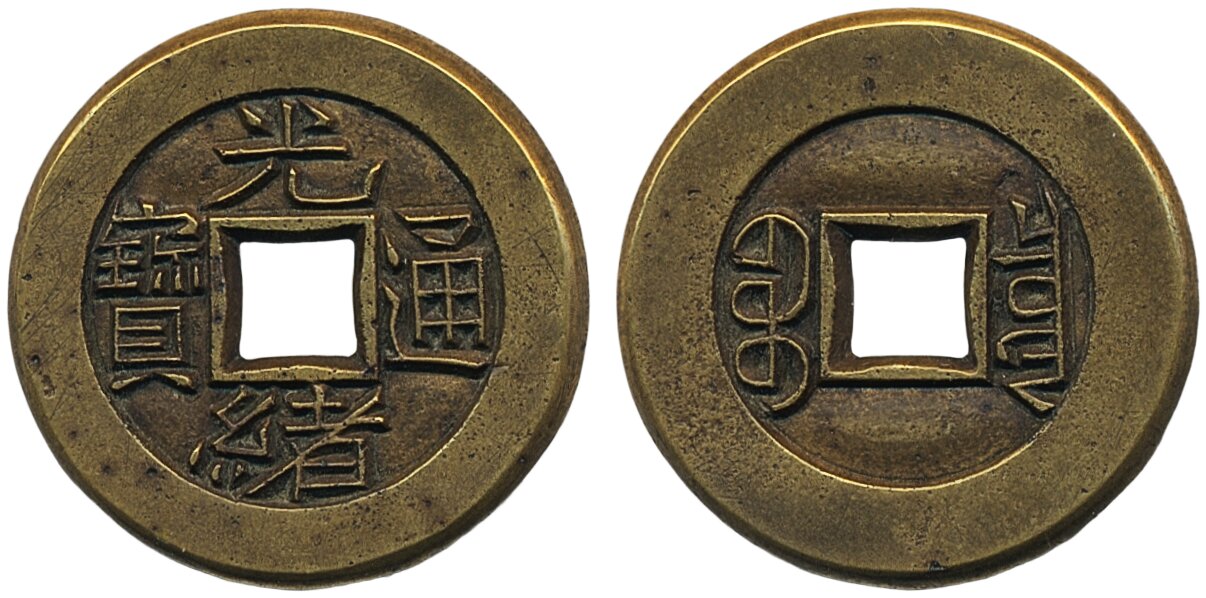 Coins, China, Ancient. Qing Dynasty - Emperor De Zong (1875-1908), Hartill 22.1277, 1 cash ND. Board of Revenue mint. 5.47 g. 29 mm. High grade example with conical edge showing typical characteristics of a mother coin (mu qian). From collection of Scandinavian origin. XF.