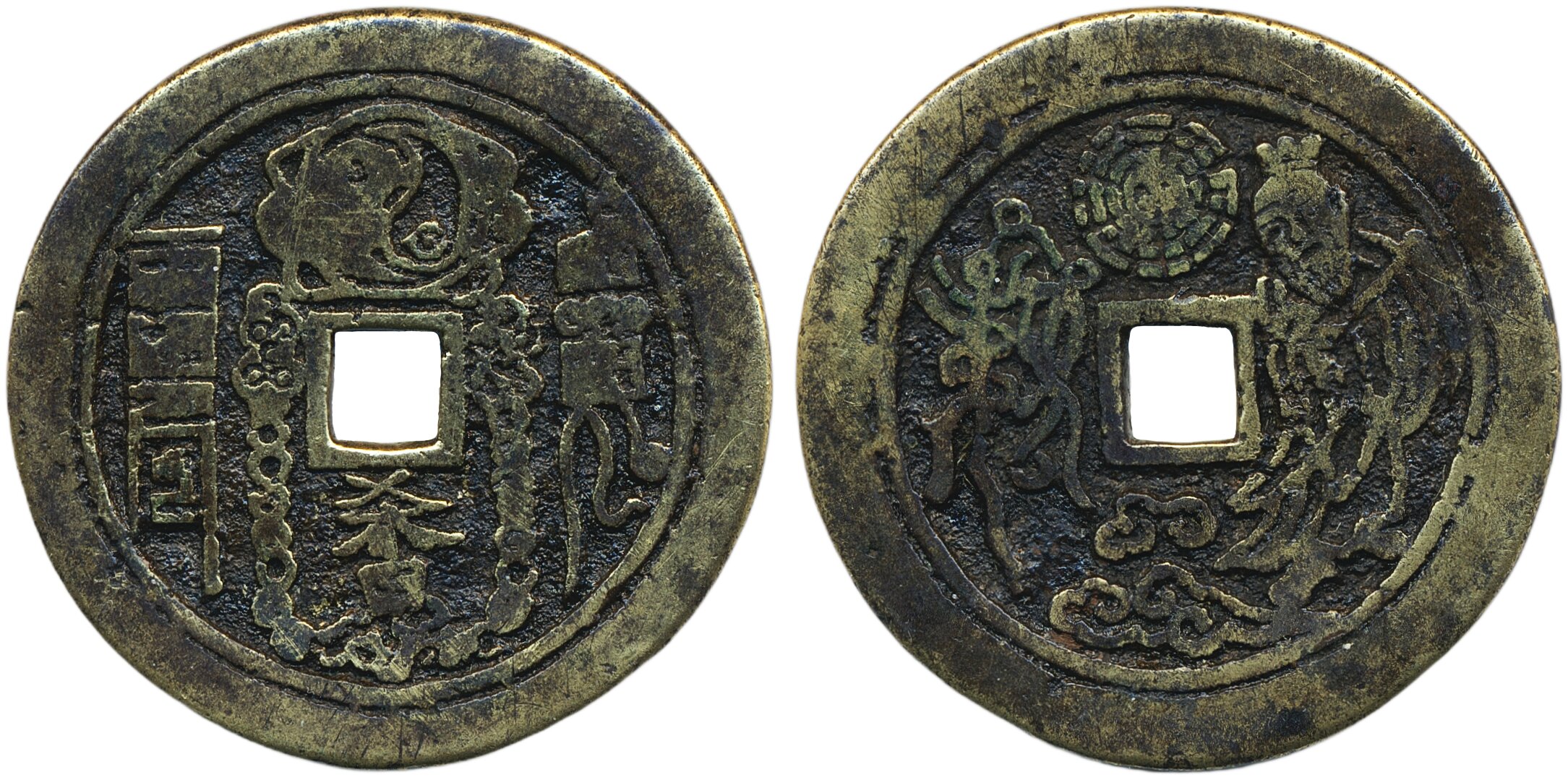 Medals, regal, China, Ancient. 22.76 g. 45 mm. Daoist curse charm, Qing Dynasty. Square centre hole. Reverse showing clouds at bottom. VF.