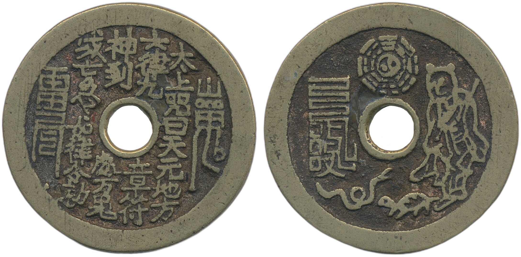 Medals, regal, China, Ancient. CCH -1792 var, 20.68 g. 44 mm. Daoist curse charm, Qing Dynasty. Round centre hole. Reverse showing snake and turtle at bottom. VF-XF.