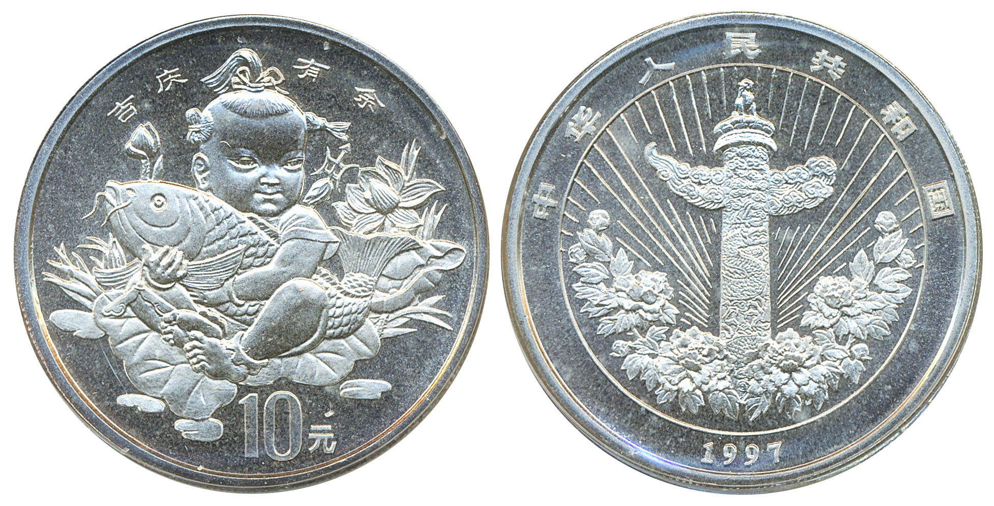 Coins, China, People’s Republic. KM P30, 10 yuan 1997. Auspicious matters. Piedfort issue in original packaging. Two ounces of pure silver. UNC.