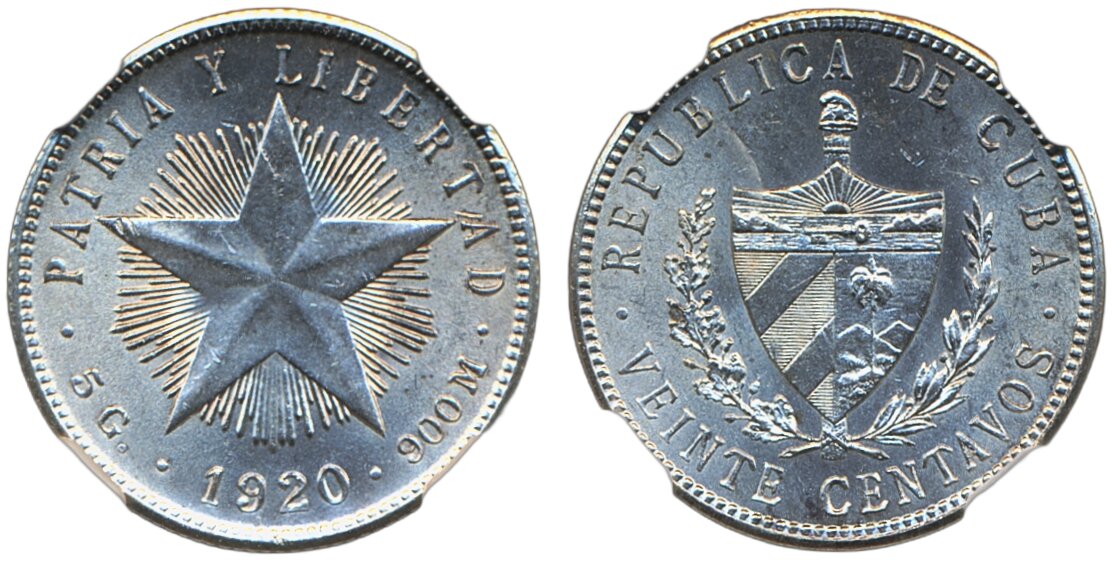 Coins, Kuba (US). KM 13.2, 20 centavos 1920. Graded by NGC as MS62. XF-UNC. See certification at NGC