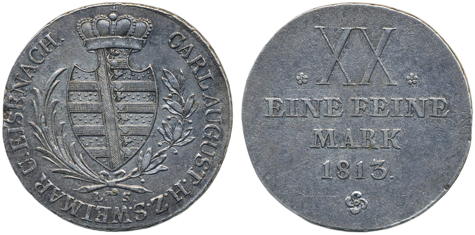 Coins, Germany, Saxe-Weimar-Eisenach. Carl August (1775-1828), KM 167, ½ taler (20 mark) 1813. 13.81 g. Planchet flaw at edge. Jaeger 514. VF.