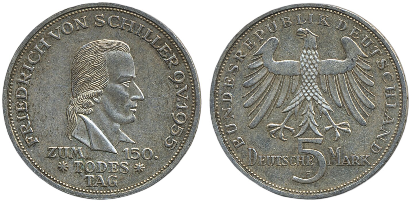 Coins, Germany, GFR (BRD). KM 114, 5 mark 1955 F. Commemorative issue over 150th Anniversary of Death of Friedrich von Schiller. Jaeger 389. VF-XF.