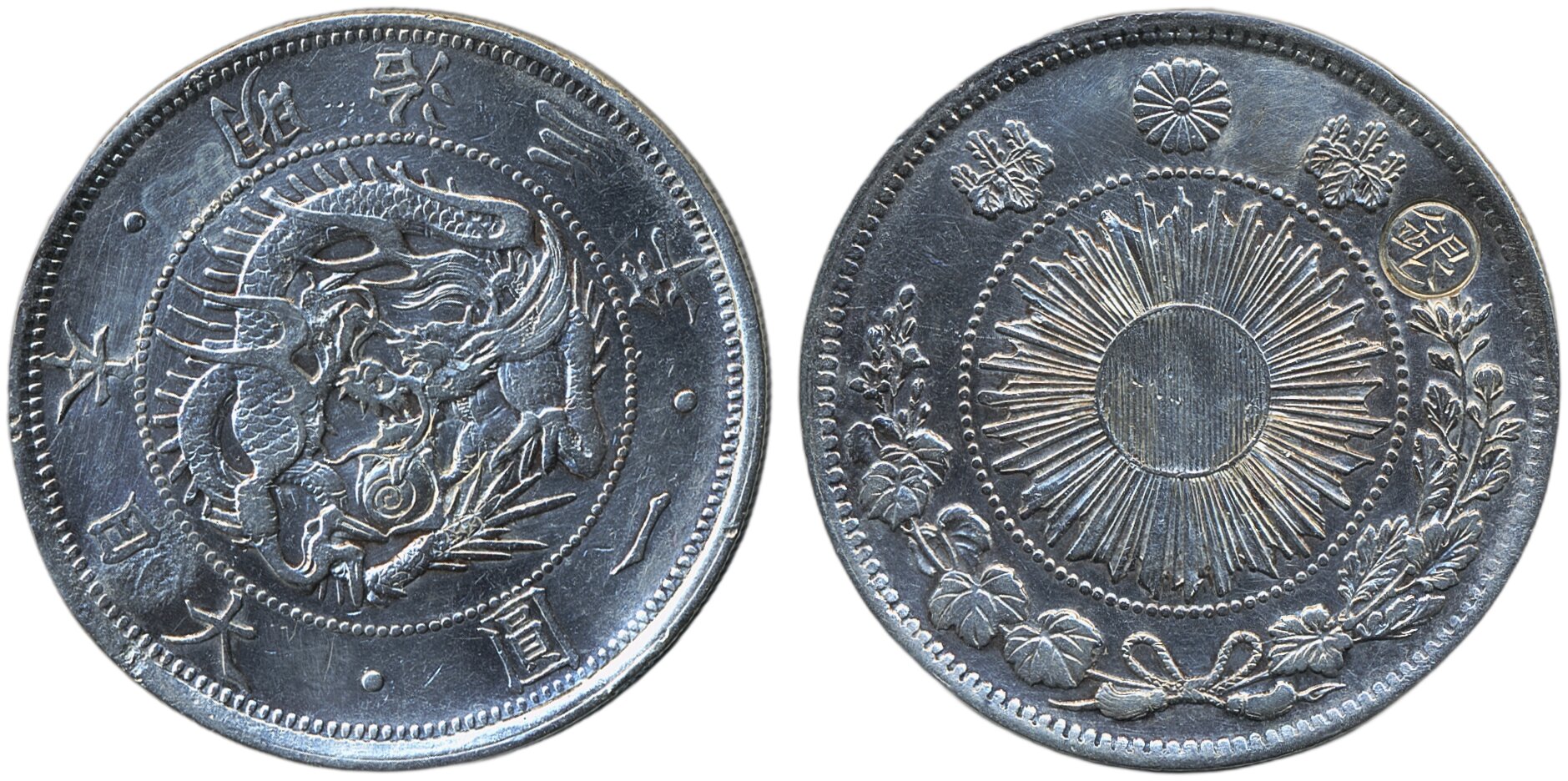 Coins, Japan. Mutushito (1868-1912), KM Y-28.1, 1 yen 1870. With countermark Gin. Cleaned. JNDA 01-9A. VF-XF.