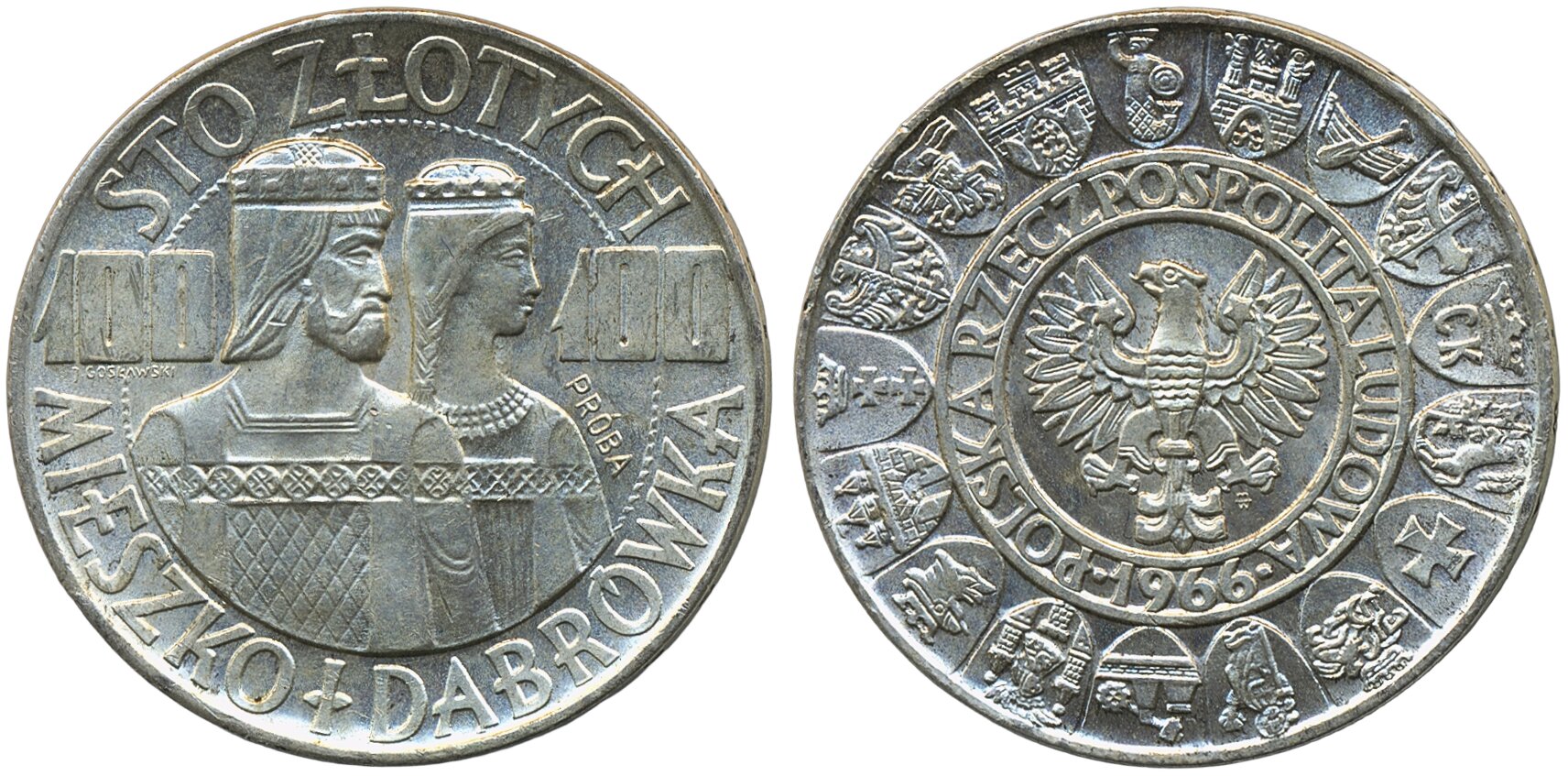 Coins, Poland. KM Pr-146, 100 zlotych 1966. PROBA in silver. Parchimovich P349a. XF-UNC.