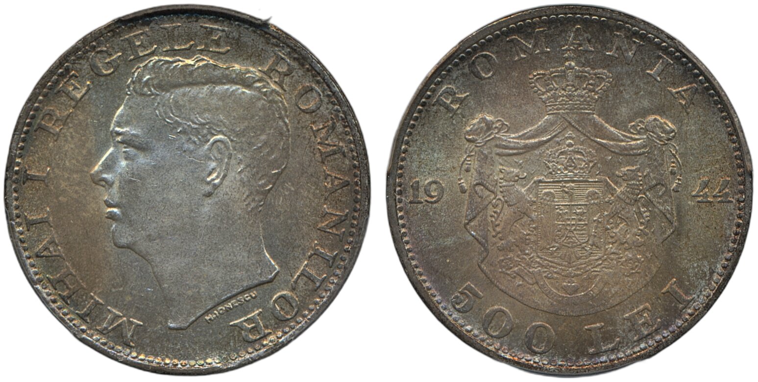Coins, Romania. KM 65, 500 lei 1944. Graded by PCGS as MS65. Beautifully toned. UNC. See certification at PCGS
