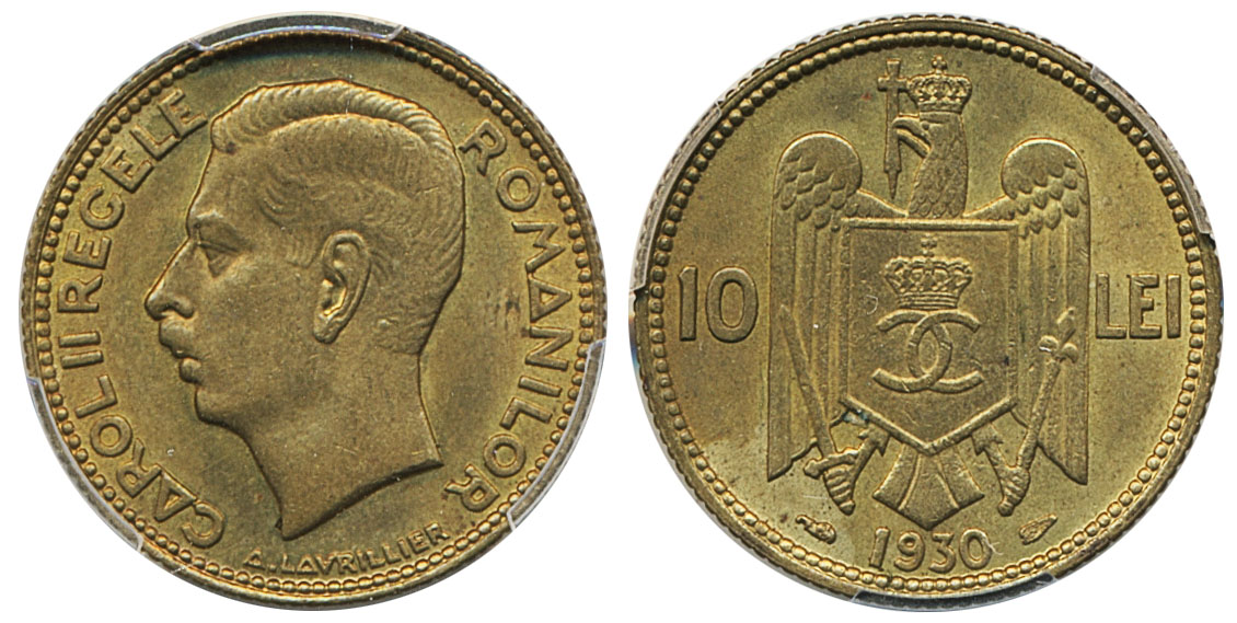 Coins, Romania. Carol II (1930-1940), KM 49, 10 lei 1930. Paris mint. Graded by PCGS as MS64. XF-UNC. See certification at PCGS