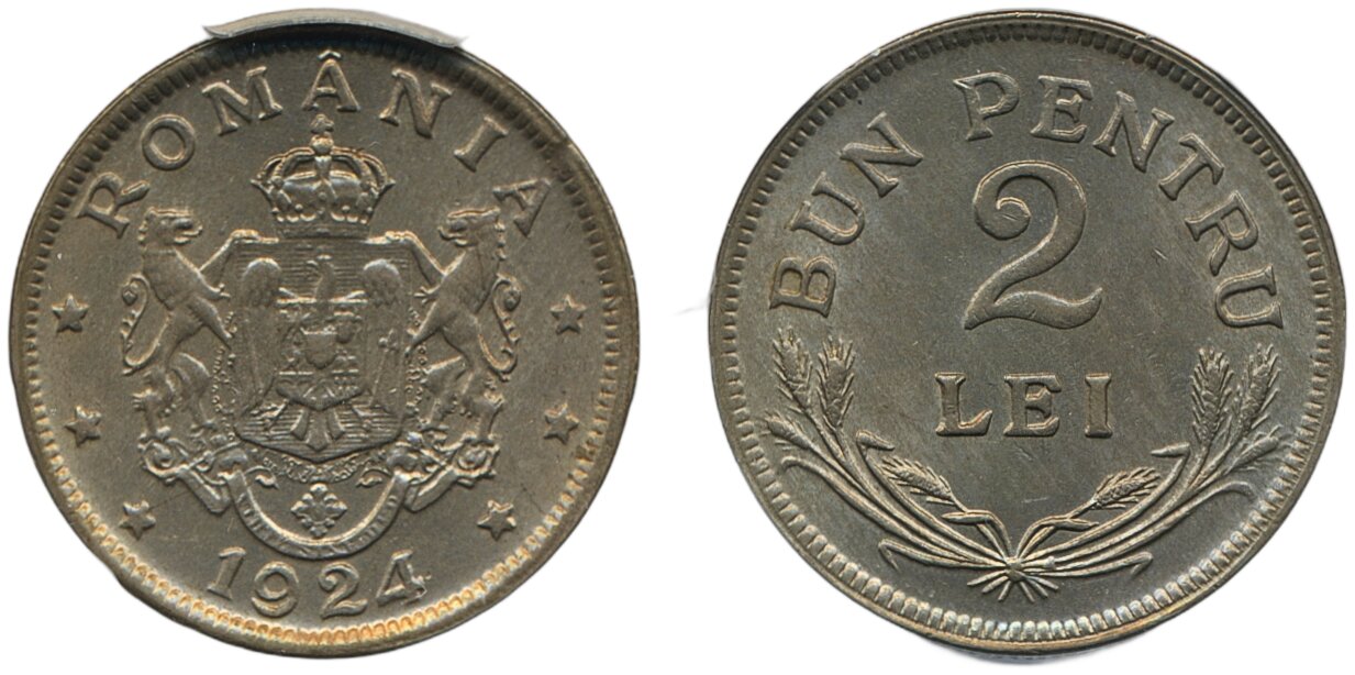 Coins, Romania. KM 47, 2 lei 1924. Graded by PCGS as MS64. XF-UNC. See certification at PCGS