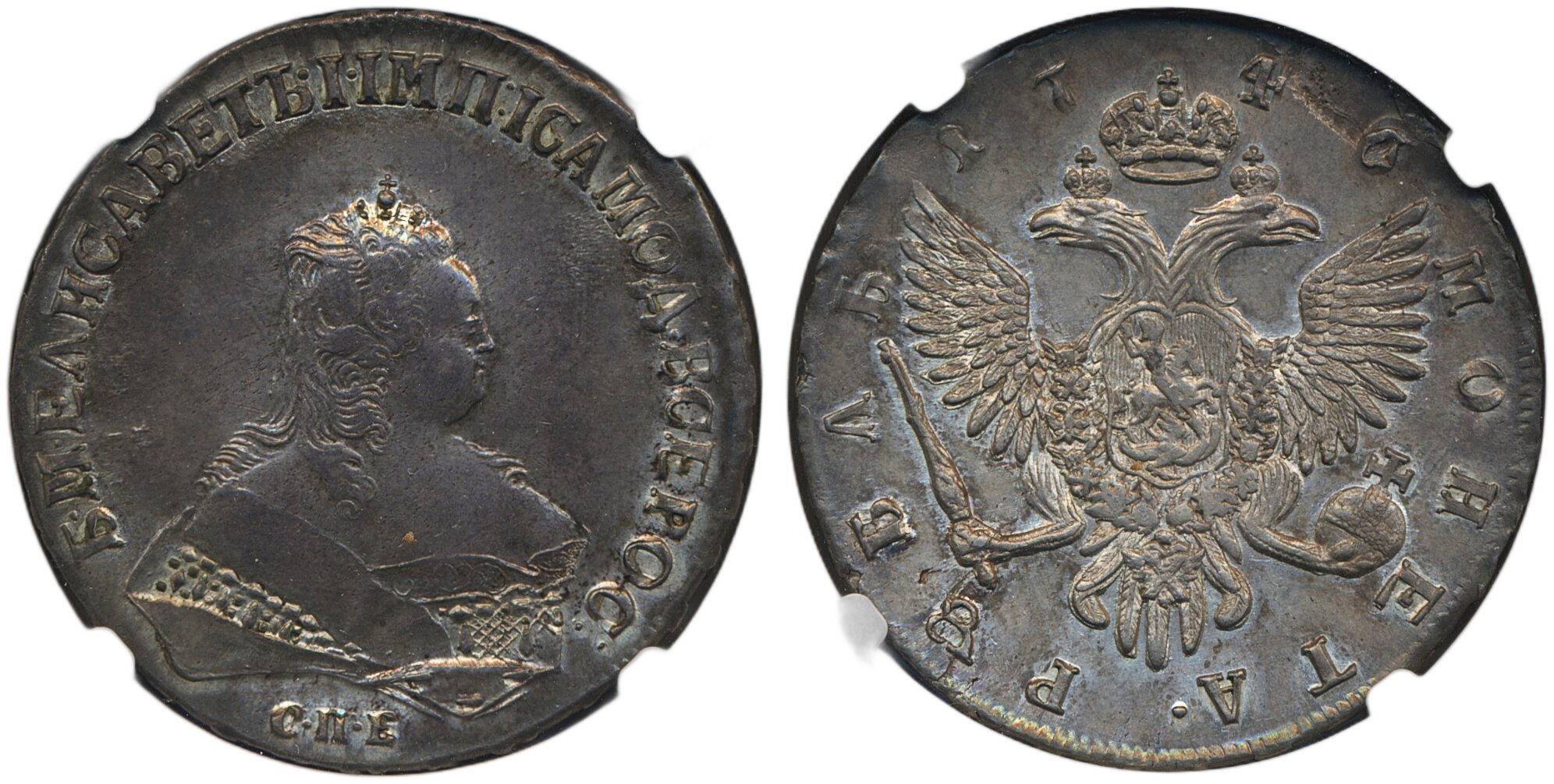 Coins, Russia. Elizabeth, Bitkin 261, 1 rouble 1746. 26.13 g. St. Petersburg. Beautiful example with much lustre and rainbow colours. Graded by NGC as AU58. In our opinion more uncirculated with the typical weak strike associated with this issue. XF-UNC. See certification at NGC