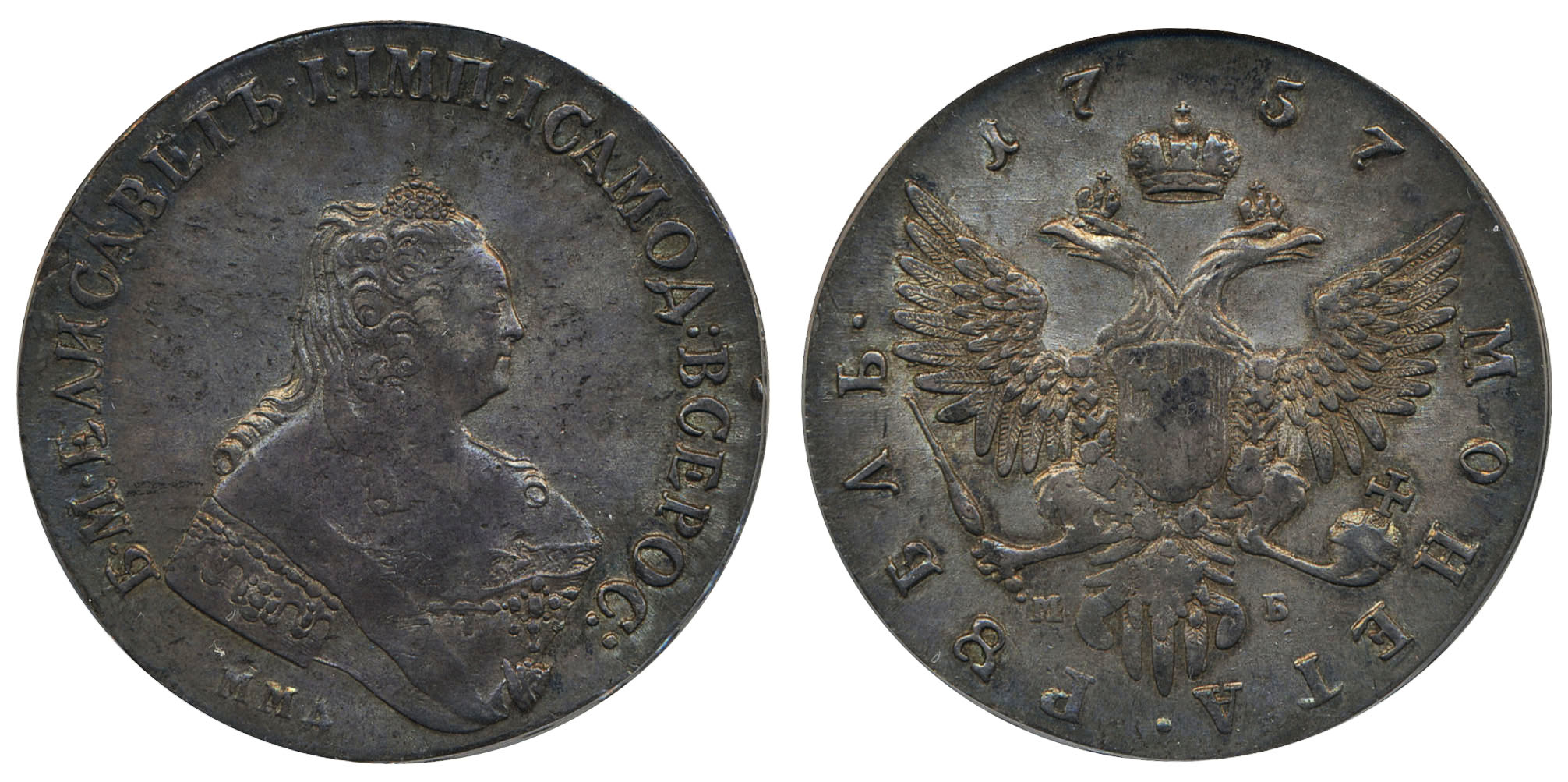 Coins, Russia. Elizabeth, Bitkin 138, 1 rouble 1757. 25.86 g. Moscow mint. Beautiful lustrous example with rainbow toning. As commonly a bit weakly struck on obverse - in our opinion conservatively graded. Graded by PCGS as AU55. XF-UNC. See certification at PCGS