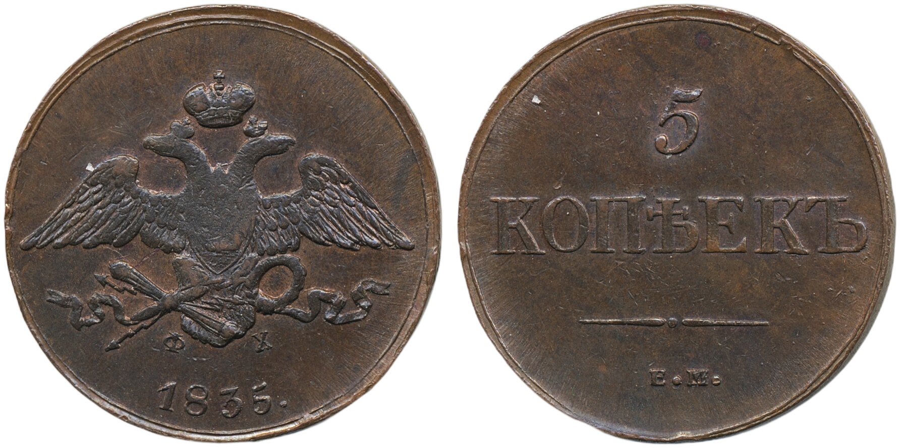 Coins, Russia. Nicholas I, Bitkin 491, 5 kopeks 1835. 21.42 g. Ekaterinburg mint. Lustrous and attractive example. XF.