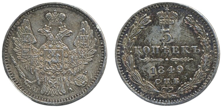 Coins, Russia. Nicholas I, Bitkin 405, 5 kopeks 1849. XF.