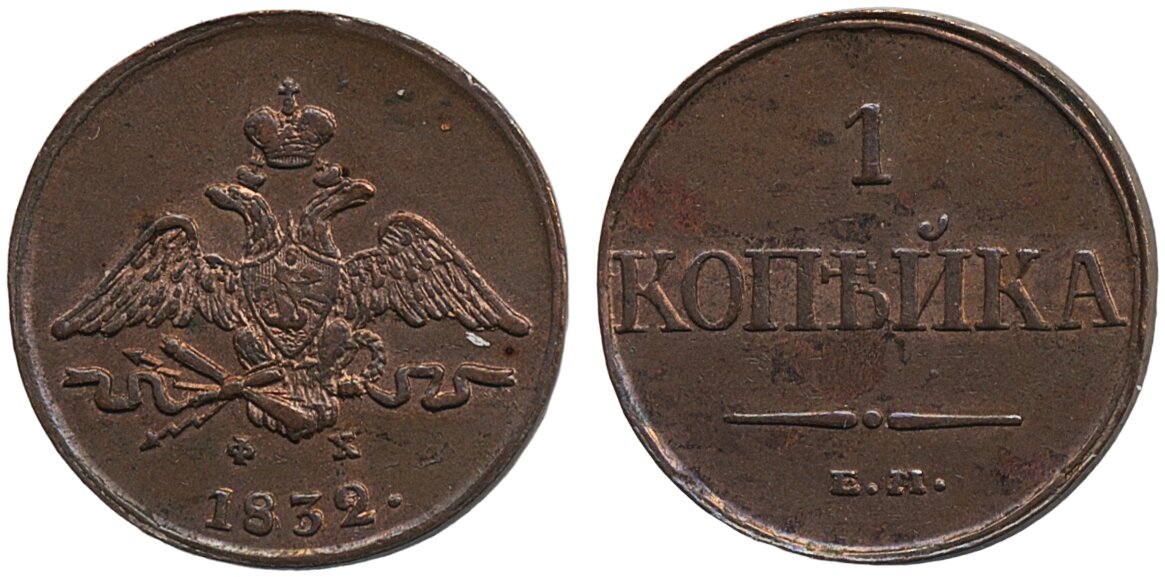 Coins, Russia. Nicholas I, Bitkin 518, 1 kopek 1832. XF-UNC.