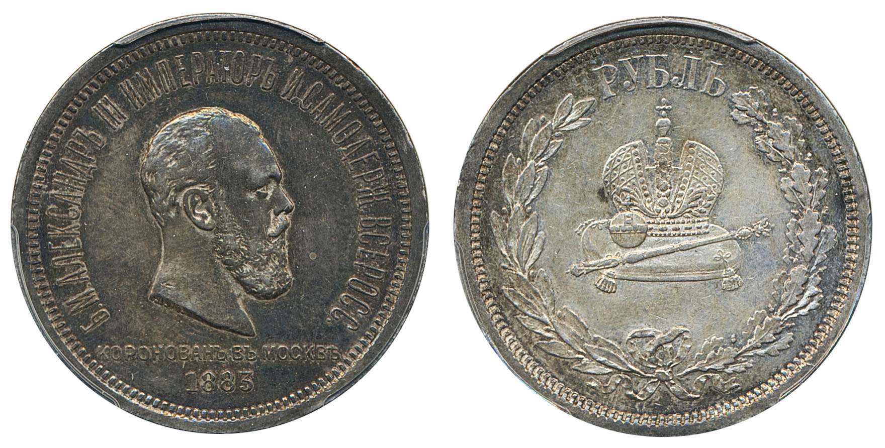 Coins, Russia. Alexander III, Bitkin 217, 1 rouble 1883. Commemorative issue to Coronation. Graded by PCGS as AU55. XF. See certification at PCGS