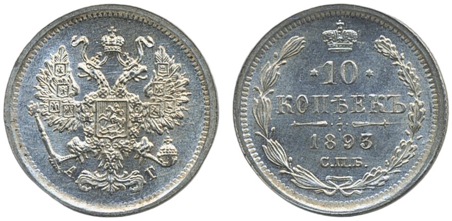 Coins, Russia. Alexander III, Bitkin 138, 10 kopeks 1893. XF-UNC.