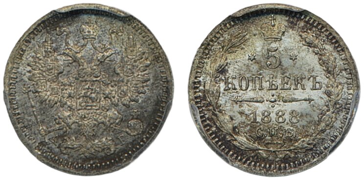Coins, Russia. Alexander III, Bitkin 148, 5 kopeks 1888. Graded by PCGS as MS65. UNC. See certification at PCGS