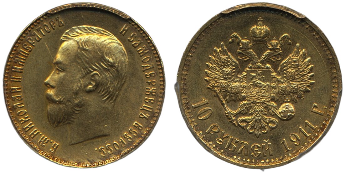 Coins, Russia. Nicholas II, Bitkin 16, 10 roubles 1911. Graded by PCGS as MS62. XF-UNC. See certification at PCGS