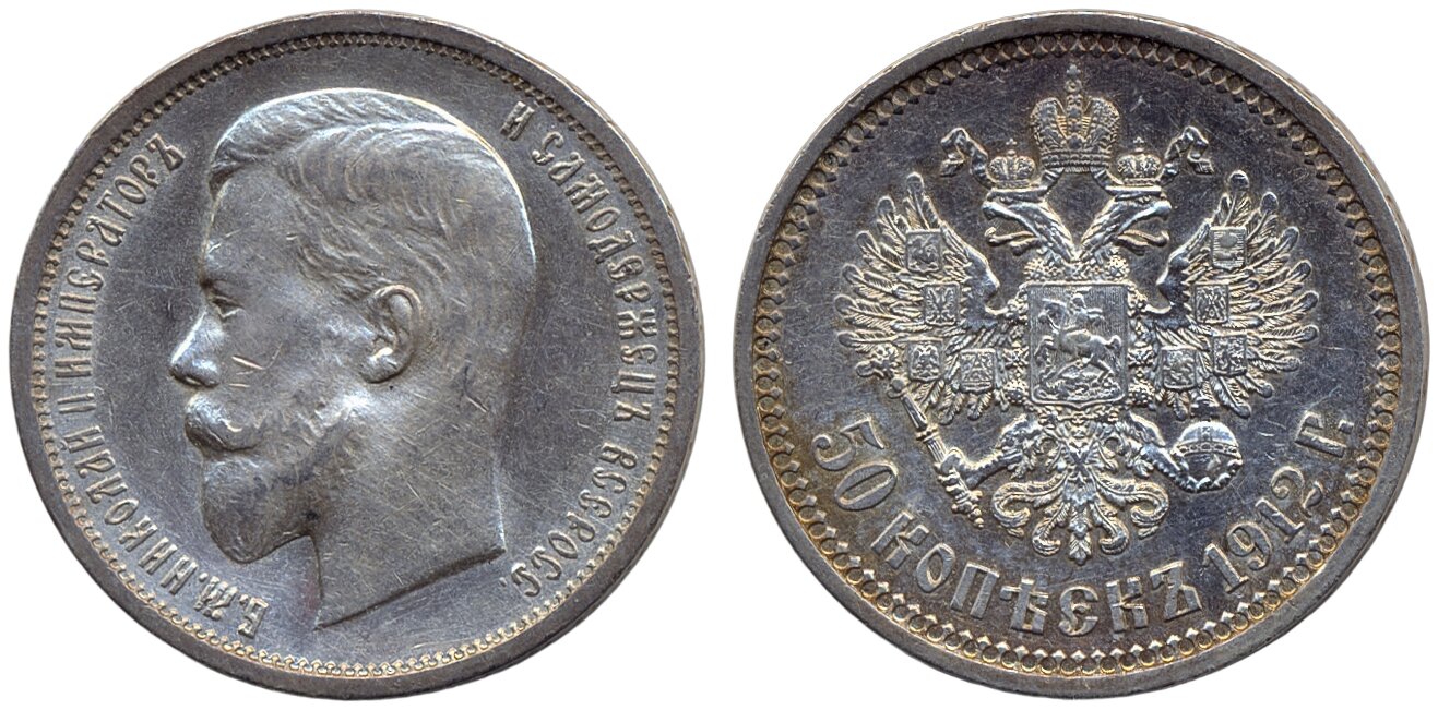 Coins, Russia. Nicholas II, Bitkin 91, 50 kopeks 1912. Obverse lightly cleaned, reverse beautiful and lustrous. XF.