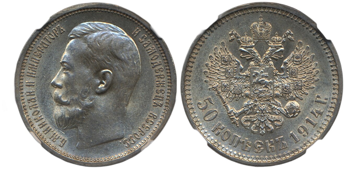 Coins, Russia. Nicholas II, Bitkin 94 (R), 50 kopeks 1914. Graded by NGC as MS62. XF-UNC. See certification at NGC