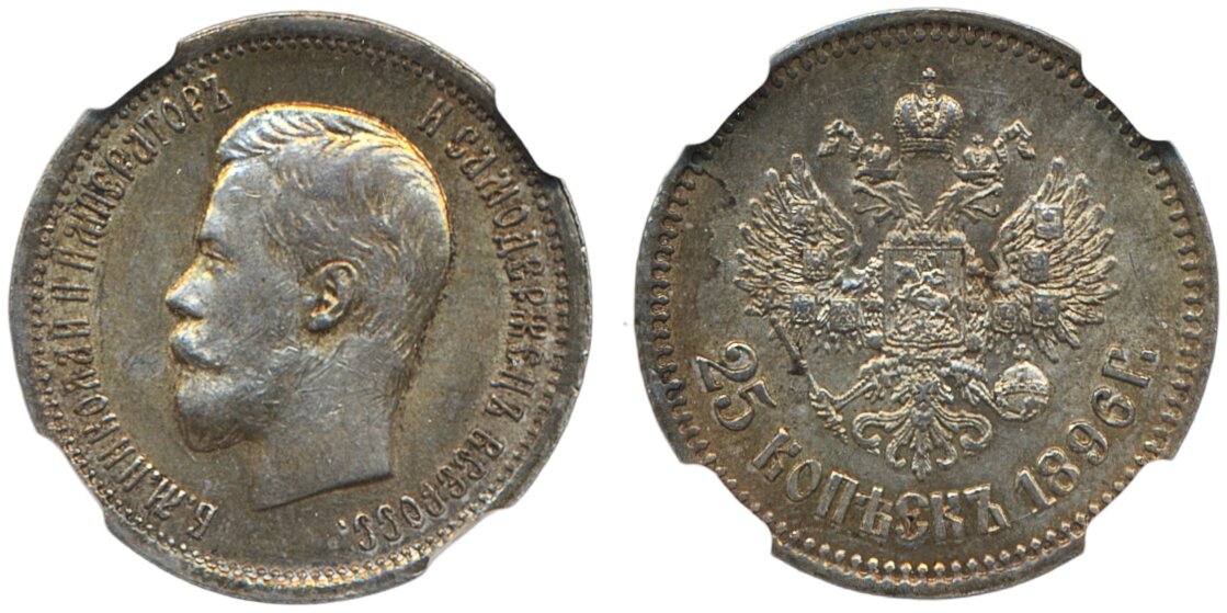 Coins, Russia. Nicholas II, Bitkin 96, 25 kopeks 1896. Graded by NGC as AU58. XF. See certification at NGC
