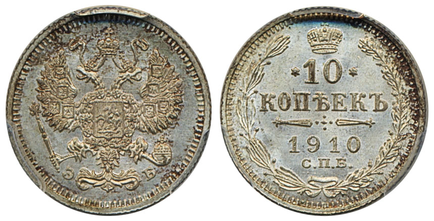 Coins, Russia. Nicholas II, Bitkin 162, 10 kopeks 1910. Graded by PCGS as MS66. UNC. See certification at PCGS