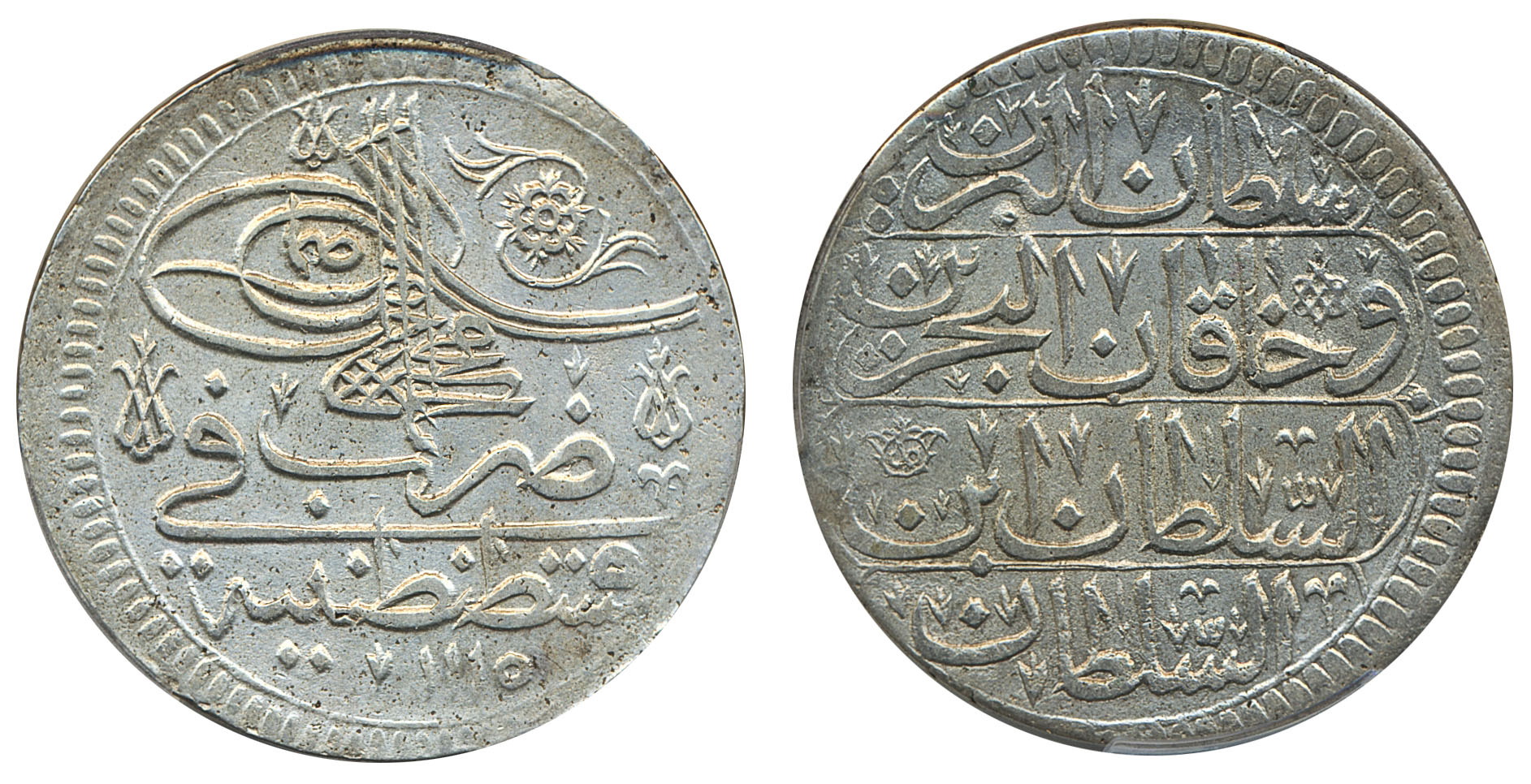 Coins, Turkey. KM 159, 1 kurush AH1115 (1702). Graded by PCGS as AU58. XF. See certification at PCGS